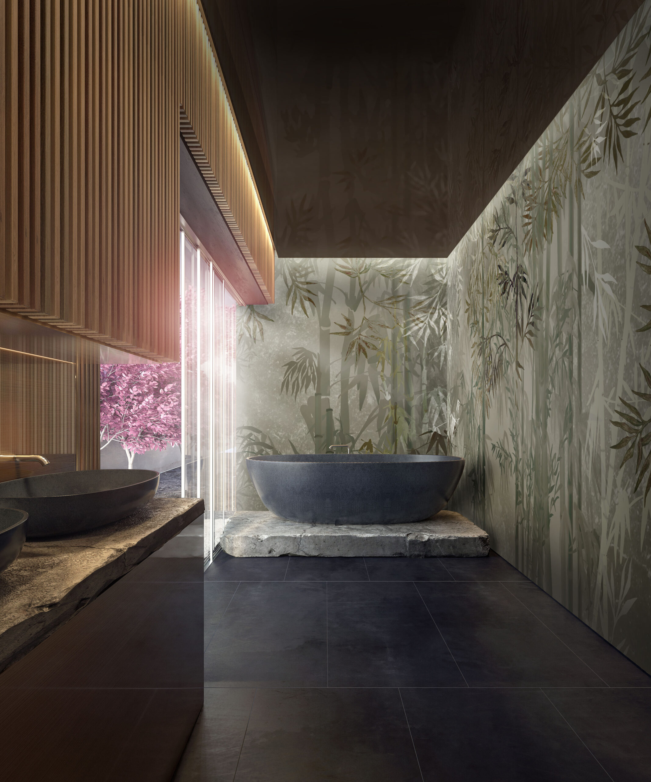 Discover the regal bamboo in daisy james‘ wallpaper: “The Bamboo Green”. With its impressive height and shadowy beauty, it captures the essence of the bamboo world. Available in four colours, it brings a sense of space, coolness, and depth to your room.