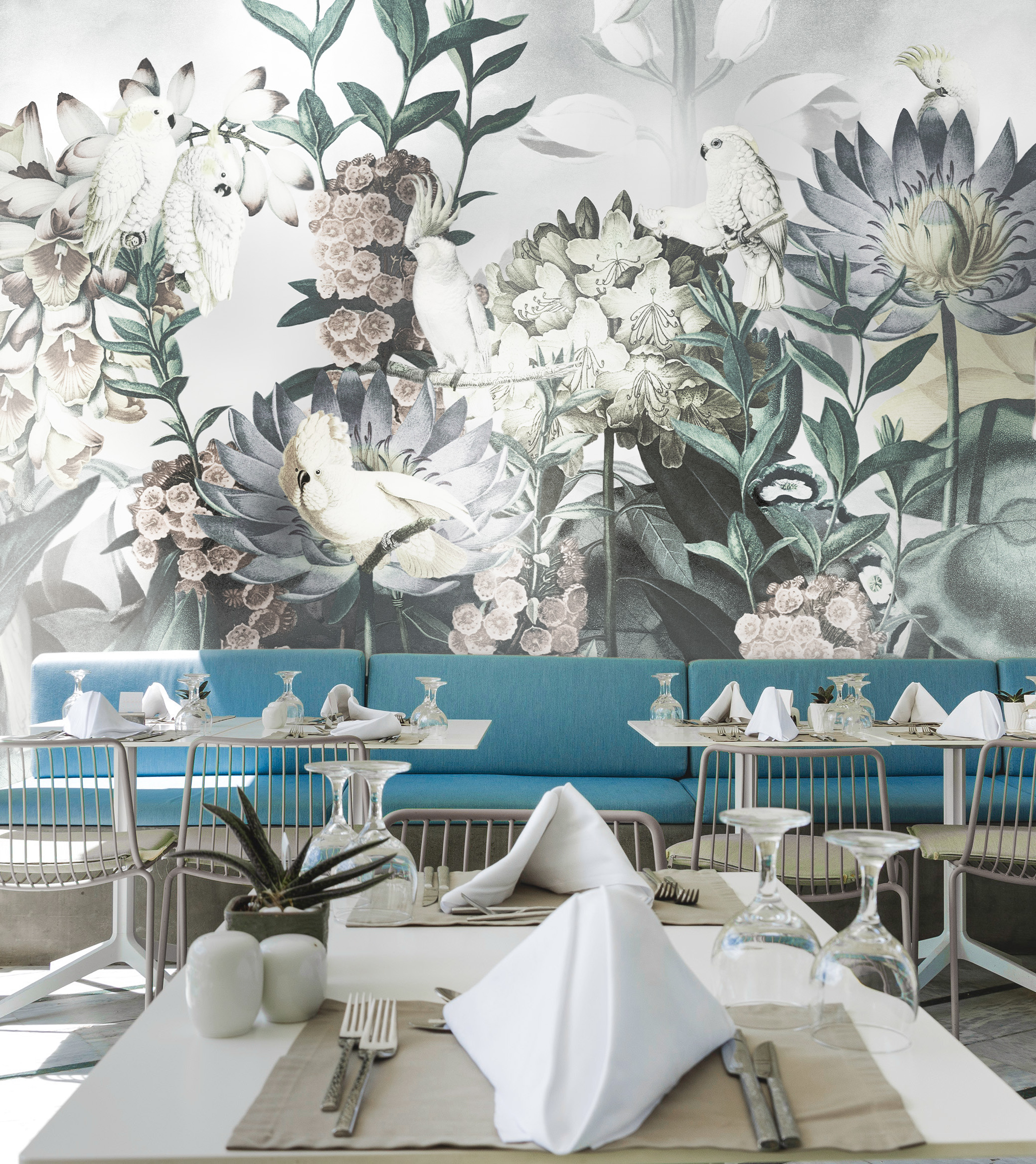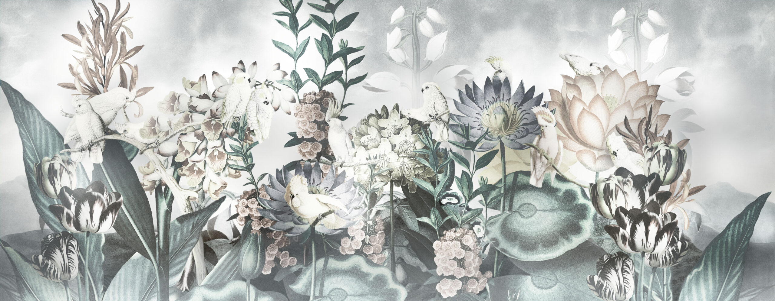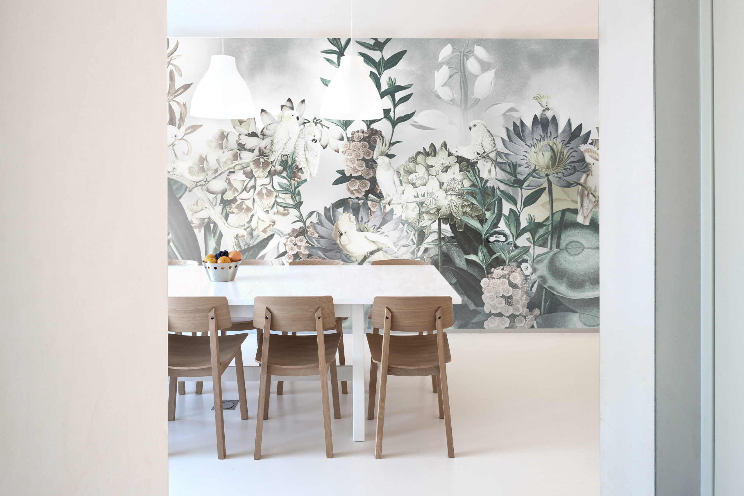 In Australia, wild colours alone don’t cut it. A proper hairdo is essential to thrive in life, and cockatoos are masters of style. Their classy white plumage looks perfect on this wallpaper designed by daisy james. “The Alba” is elegantly white, ensuring a sophisticated and calming atmosphere while the charismatic cockatoos add a touch of allure that captures every eye.