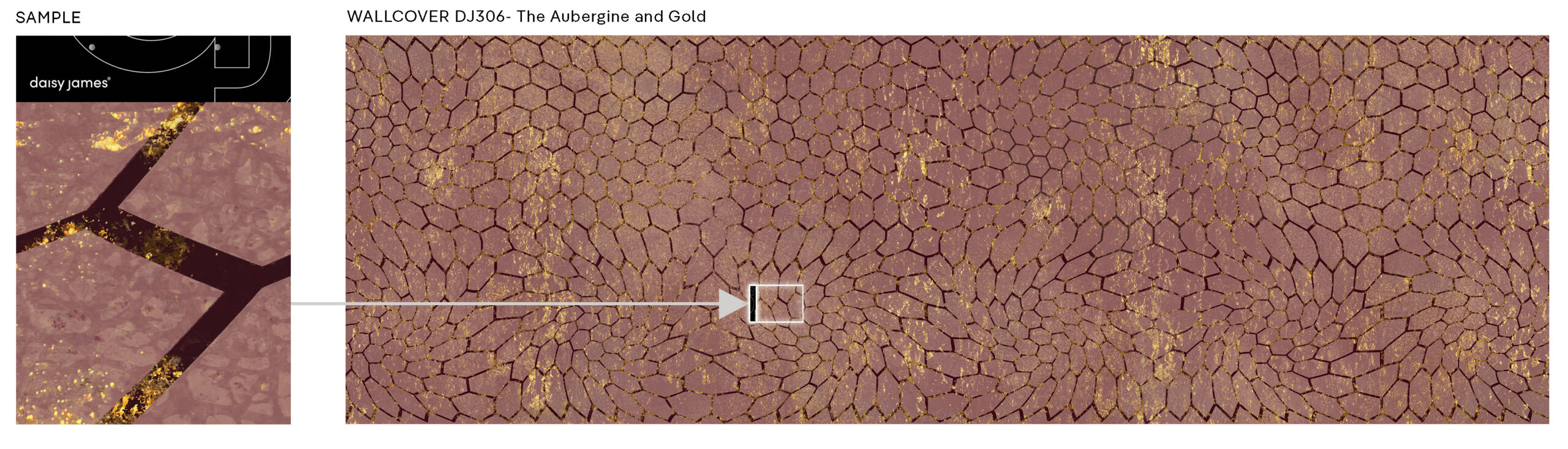 Presenting “The Aubergine and Gold” by daisy james. The perfect combination of aubergine and gold exudes timeless elegance, reminiscent of ancient Rome and beyond. The intricate honeycomb pattern adds a touch of uniqueness to create something truly special for your walls.
