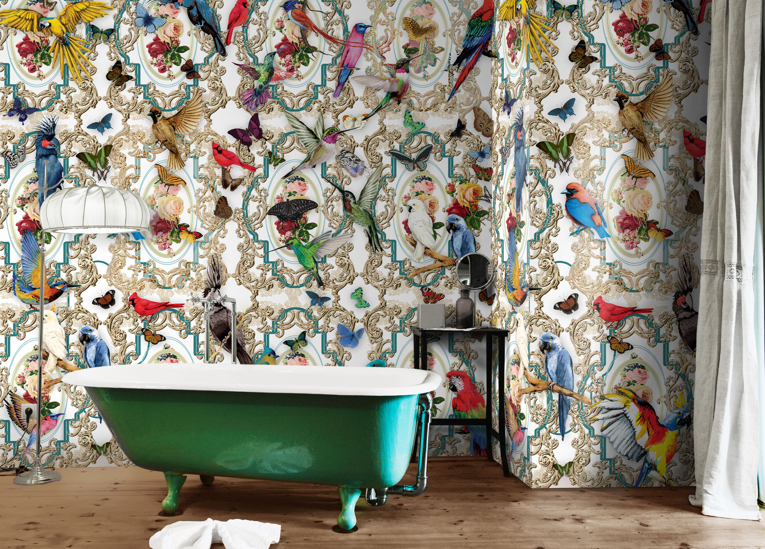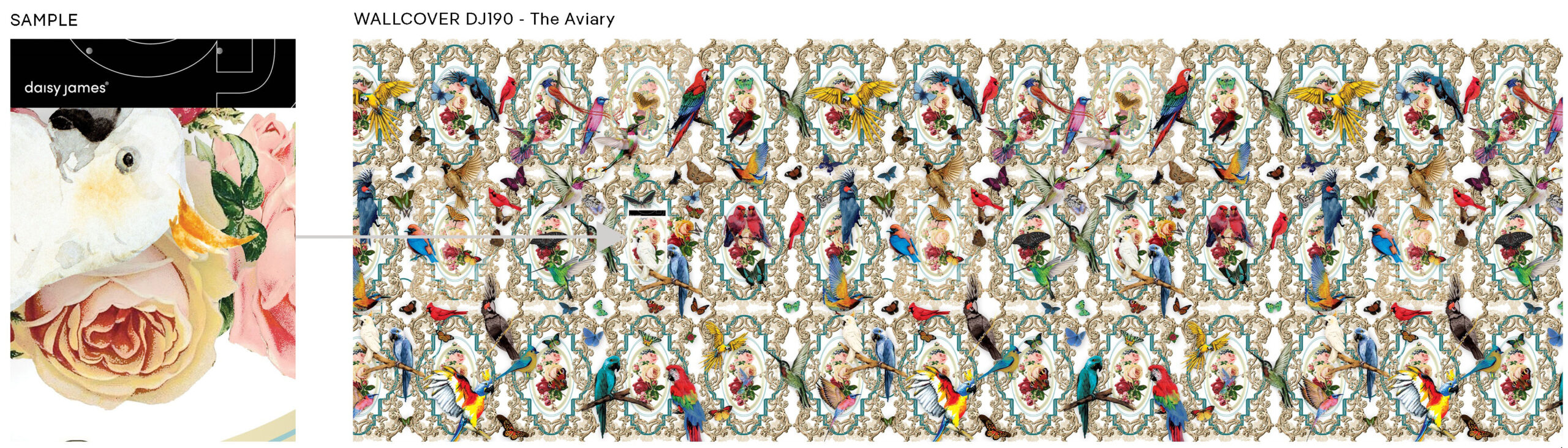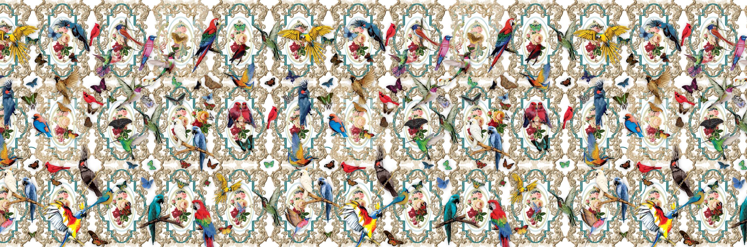 Explore the enchanted realm of this wallpaper design: “The Aviary” by daisy james. Immerse in timeless symbolism, where birds embody wisdom, peace, and fertility. Admire their freedom without harm, preserving their essence through art.