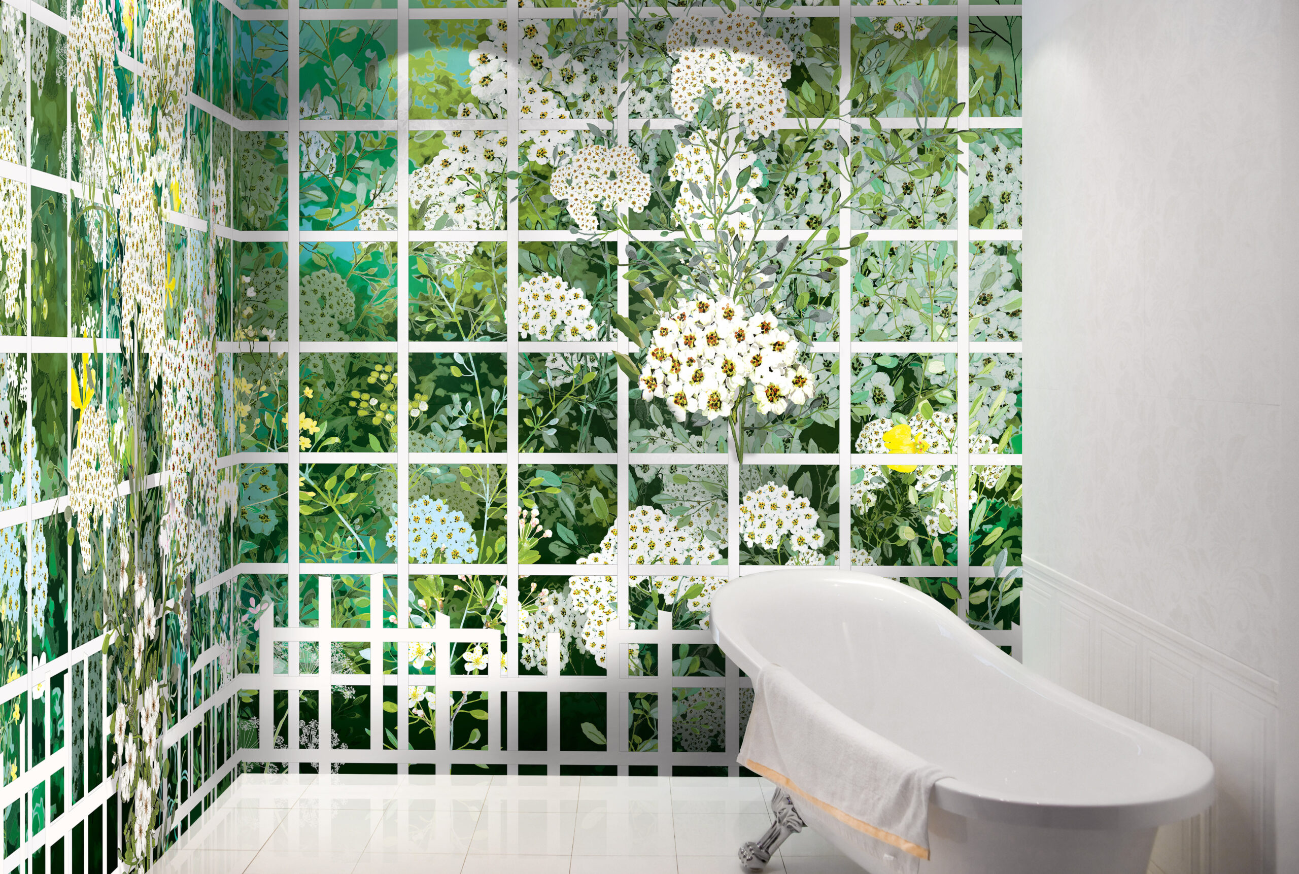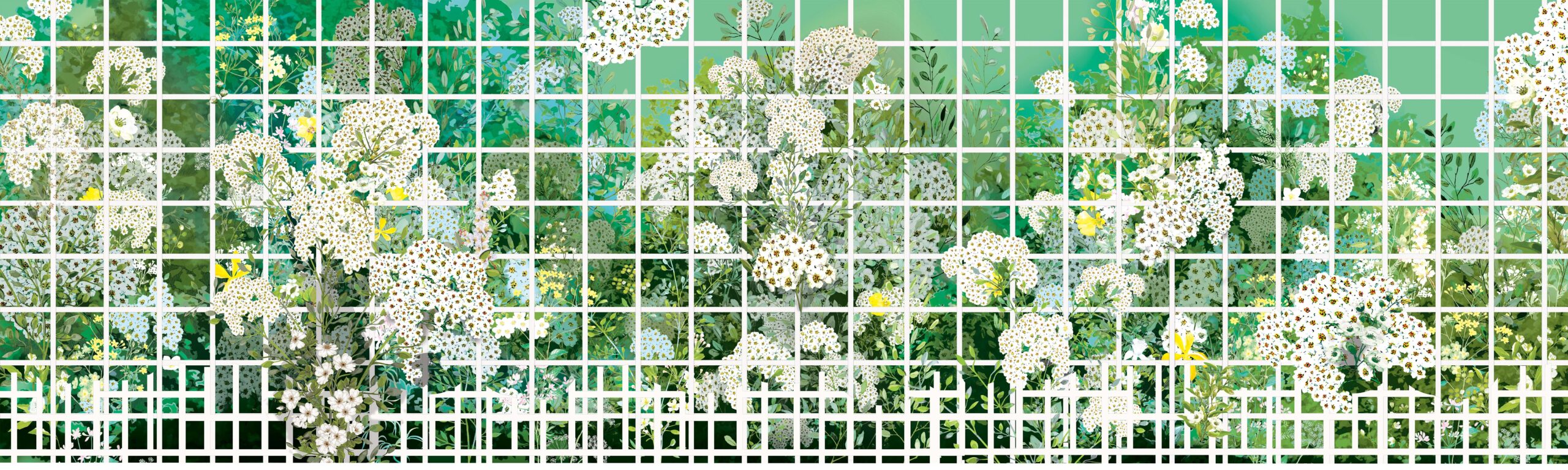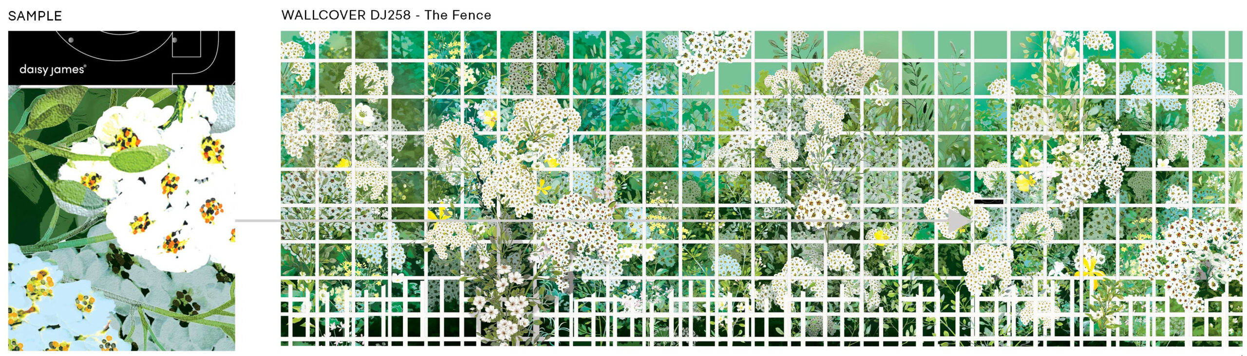 daisy james embraces eco-consciousness with “The Fence”, a celebration of spring’s vibrant essence. Delicate white flowers emerge through a white fence, evoking the buzzing of bumblebees. The green backdrop, adorned with yellow flowers, completes the captivating natural display. Bring the invigorating spirit of spring into your space with this enchanting wallpaper.