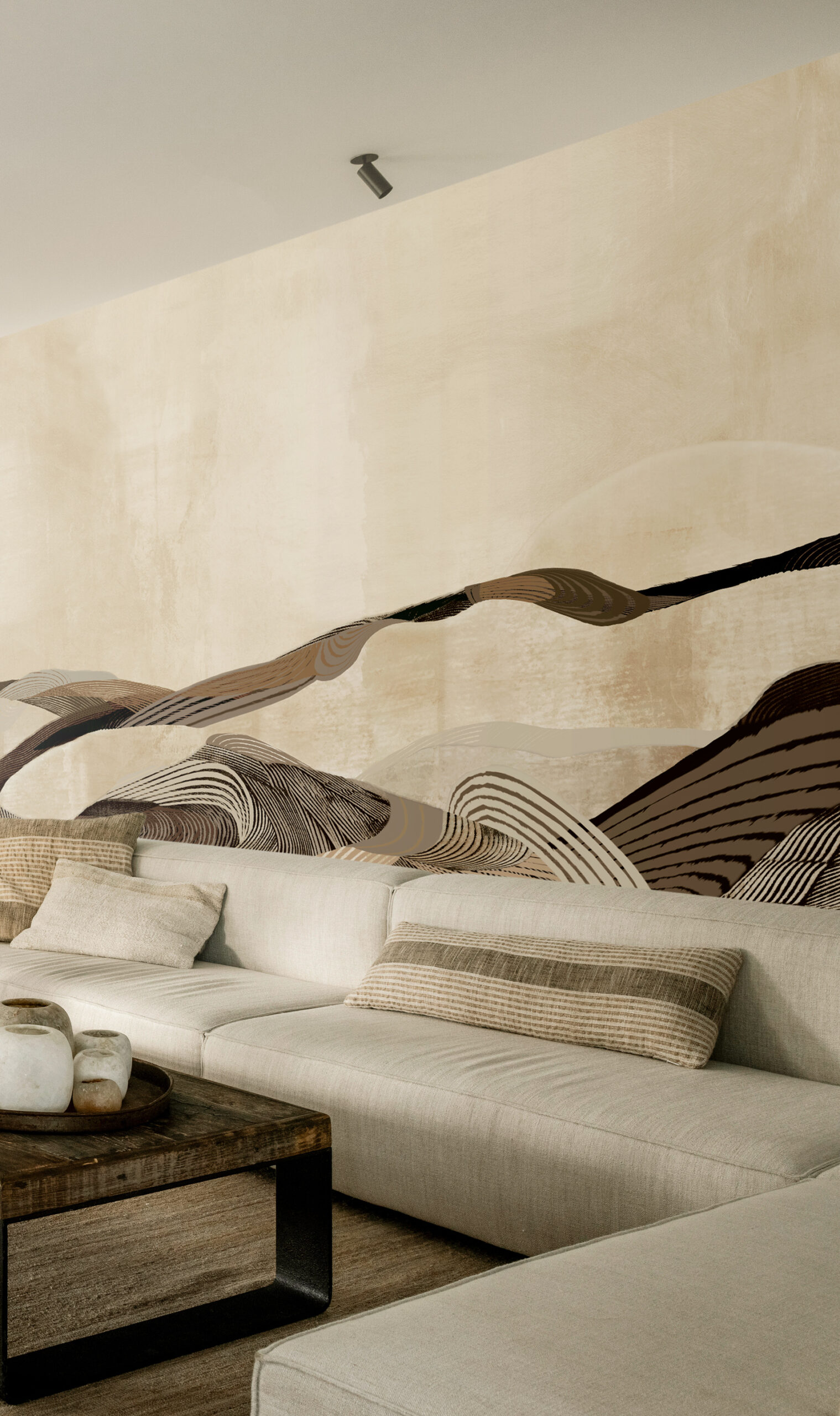 "The Luma" by daisy james is a wallcover that translates the essence of a desert landscape into a modern, abstract composition. Shades of sand, beige, and brown flow seamlessly together, creating a natural rhythm of horizontal fields and subtle brushstrokes. The result is an organic wallcovering that adds depth and character to any space. The delicate transitions between these natural hues give "The Luma" a timeless and serene appearance perfect for interiors seeking balance between natural warmth and contemporary sophistication.