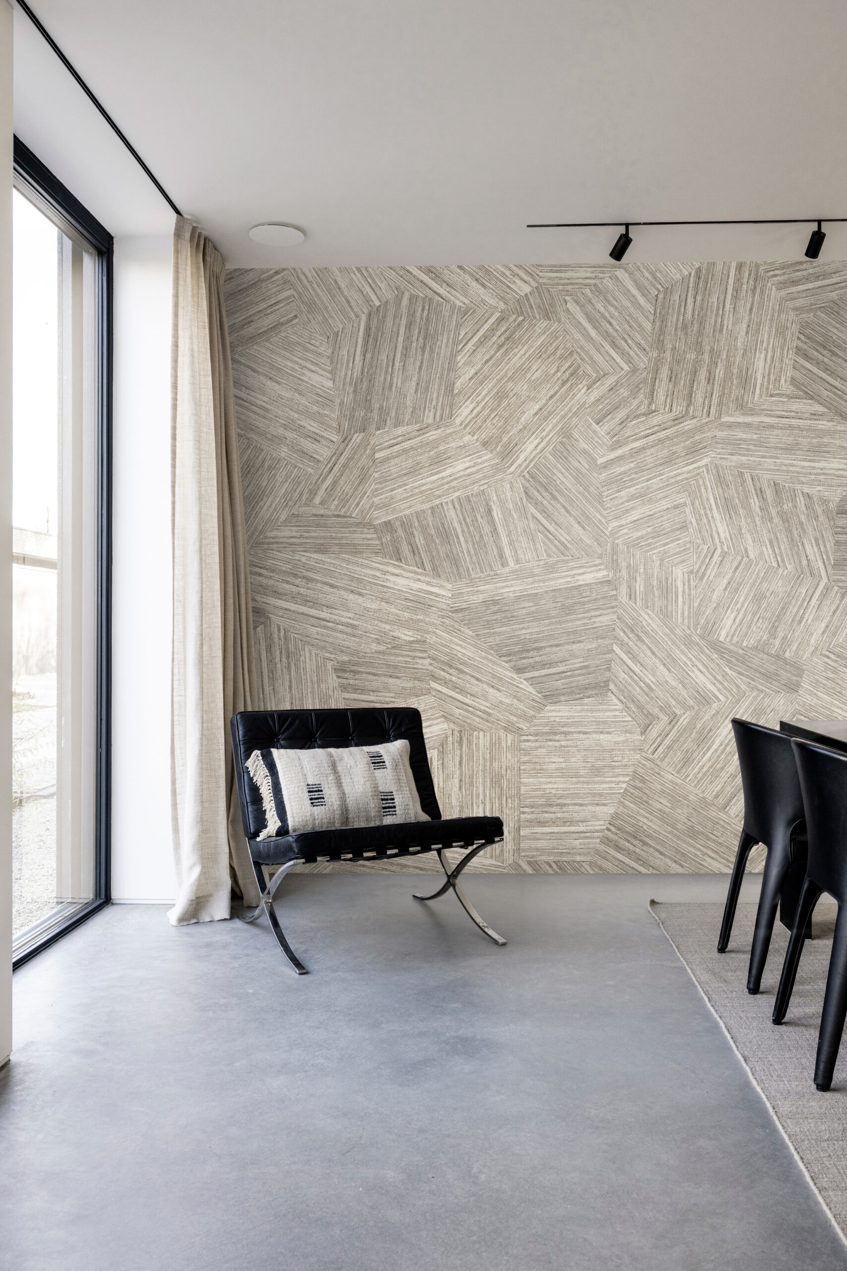 “The Lyne Beige” by daisy james is a serene wallcover that brings structure and calm into any interior. Subtle stripes, arranged in geometric panels, each with their own direction, create a refined play of lines. Combined with soft green tones, this results in a harmonious and tranquil atmosphere. The design balances minimalism with depth, making it versatile for both modern and timeless interiors.