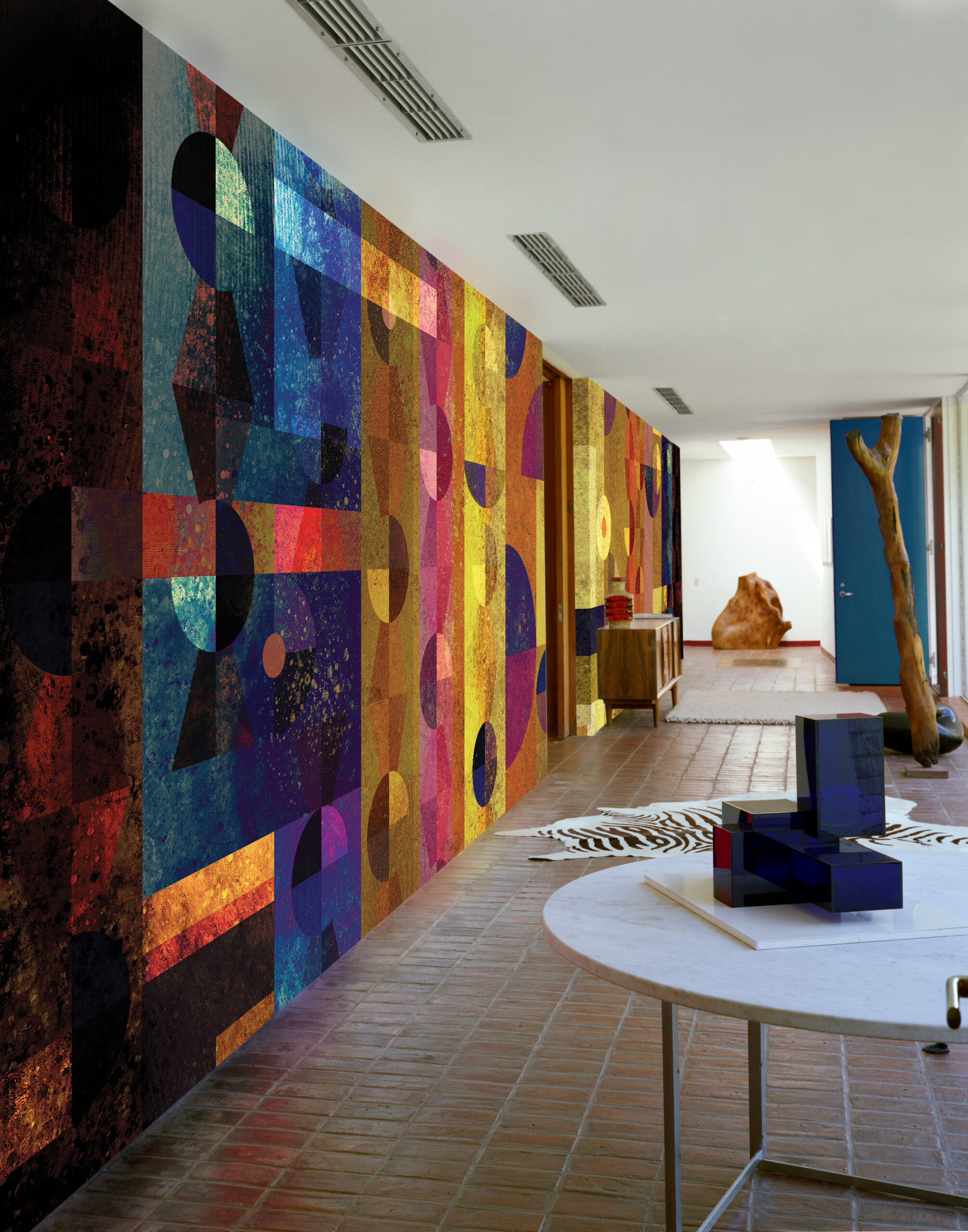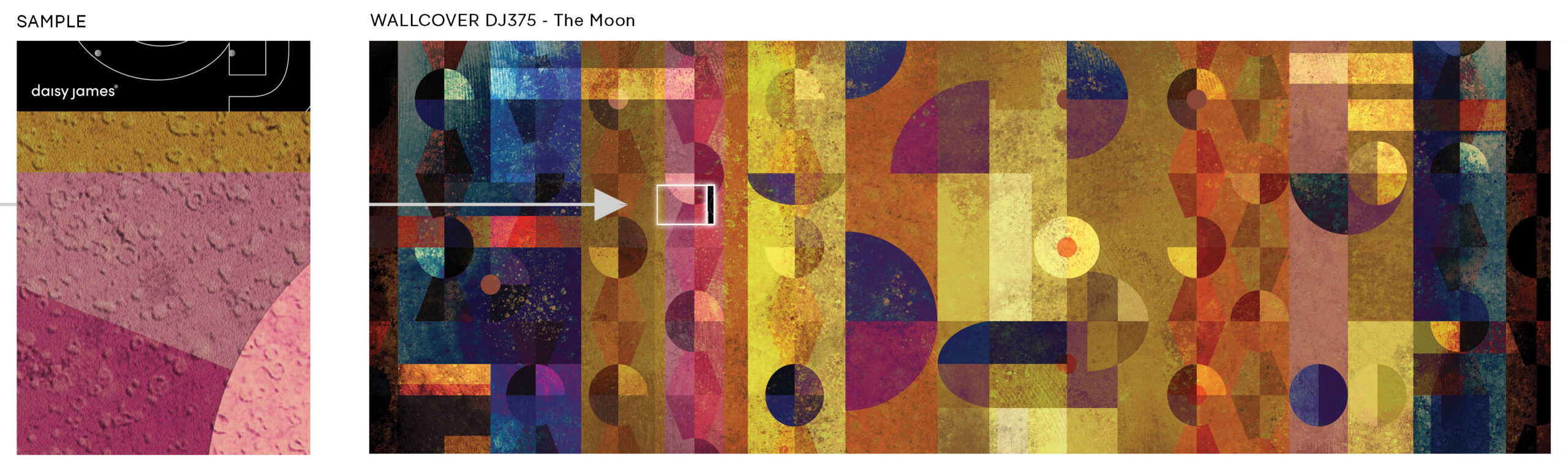 Artistic wallcovering by daisy james “The Moon”, a unique wall covering featuring a dynamic and vibrant design. This striking pattern transitions from dark to light and back again, creating a captivating visual effect. Abstract compositions of circles and shapes in extraordinary colours, such as bright blue and soft pink, add a playful yet sophisticated touch. “The Moon” is the perfect choice for interiors that seek to blend creativity with elegance, offering a stylish and artistic statement in any space.
