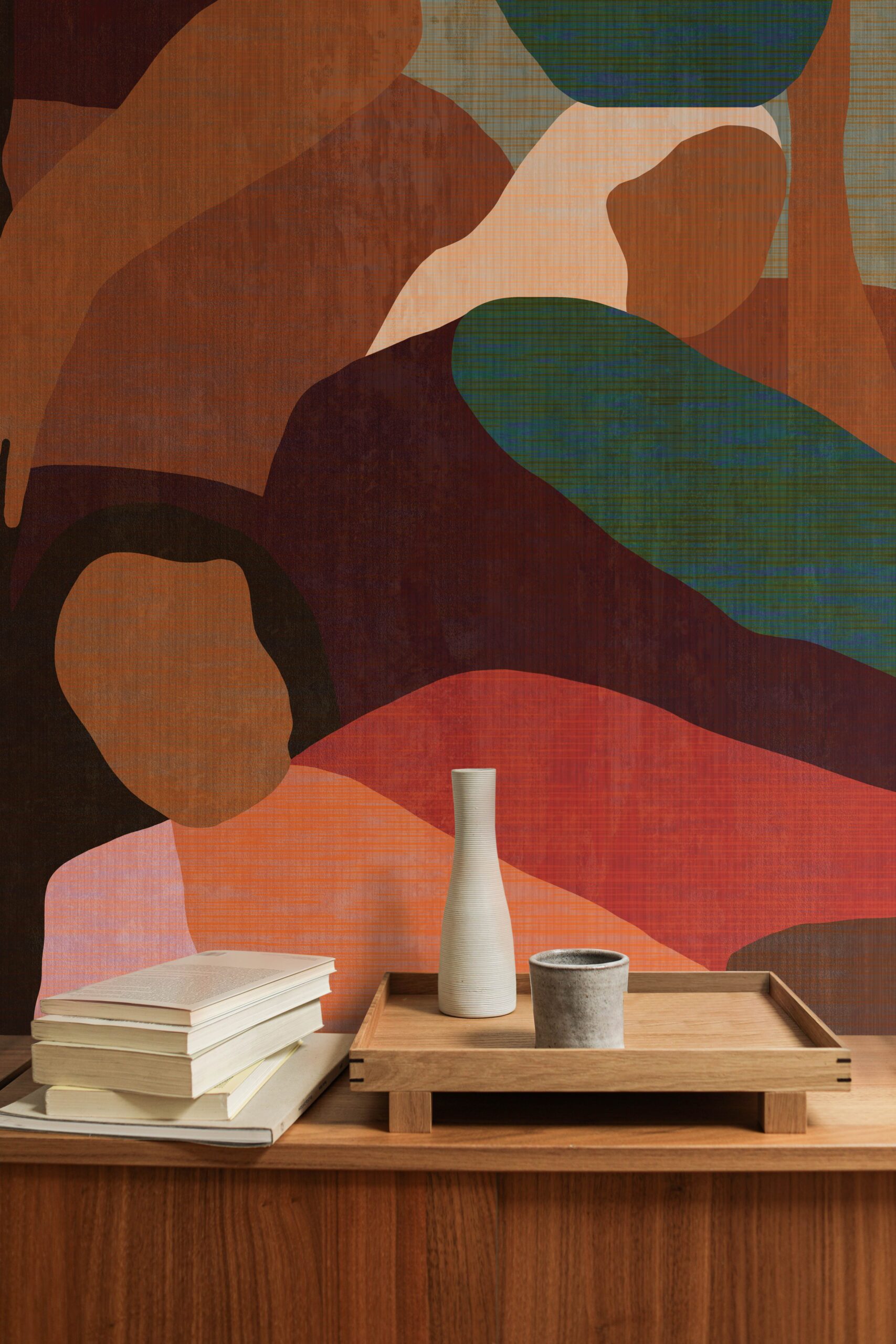 - Keep furniture and accessories calm in earthy tones or soft neutrals, allowing the design wallcover to remain the focal point.