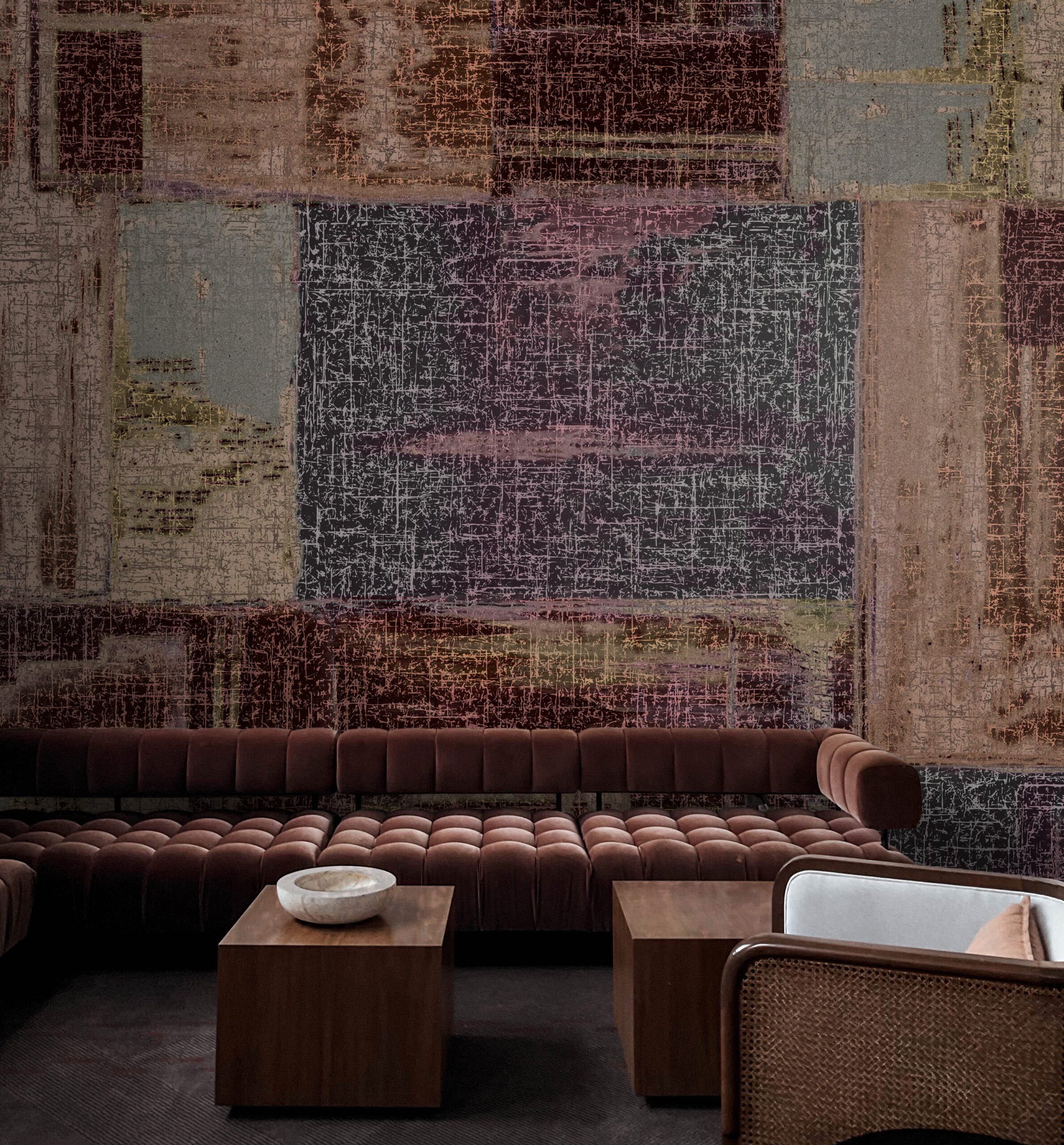 The colour palette is composed of deep brown and beige tones, layered with warm blue accents that bring balance and calm to the composition. This muted yet expressive combination creates a sophisticated and timeless look. “The Plane” feels both architectural and soft, making it a versatile choice for interiors that value materiality, texture, and understated luxury.