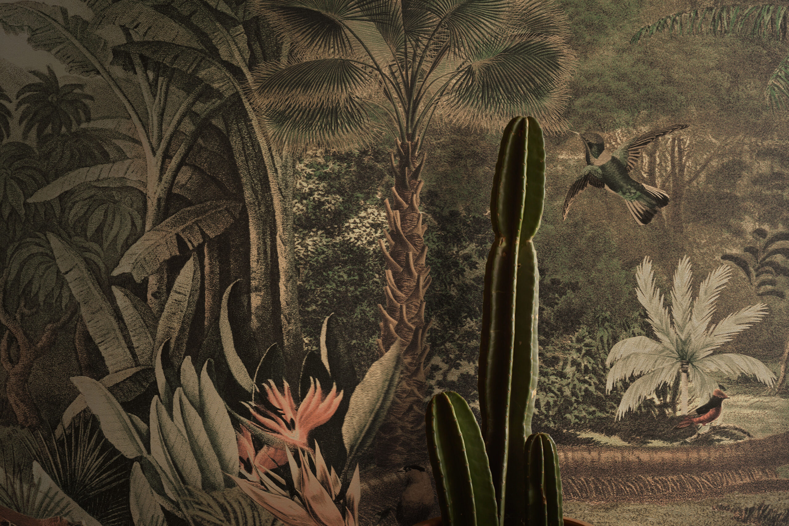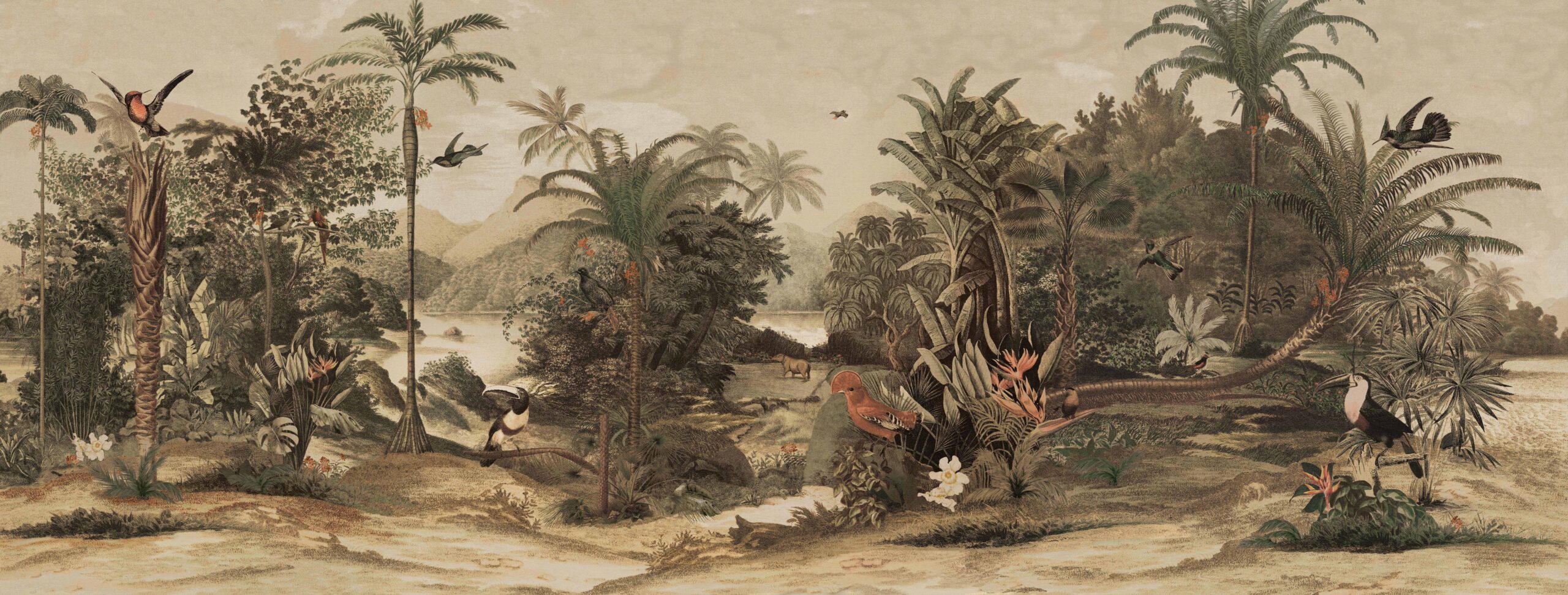 Introducing “The Red Rock” by daisy james a captivating wallpaper that brings the beauty of a lush, botanical jungle scene to life. At its heart, the majestic Red Rock Ara bird takes center stage, known for its vibrant plumage and graceful presence. In the distance, an elephant roams near a serene lake, adding depth and wonder to this classical design.