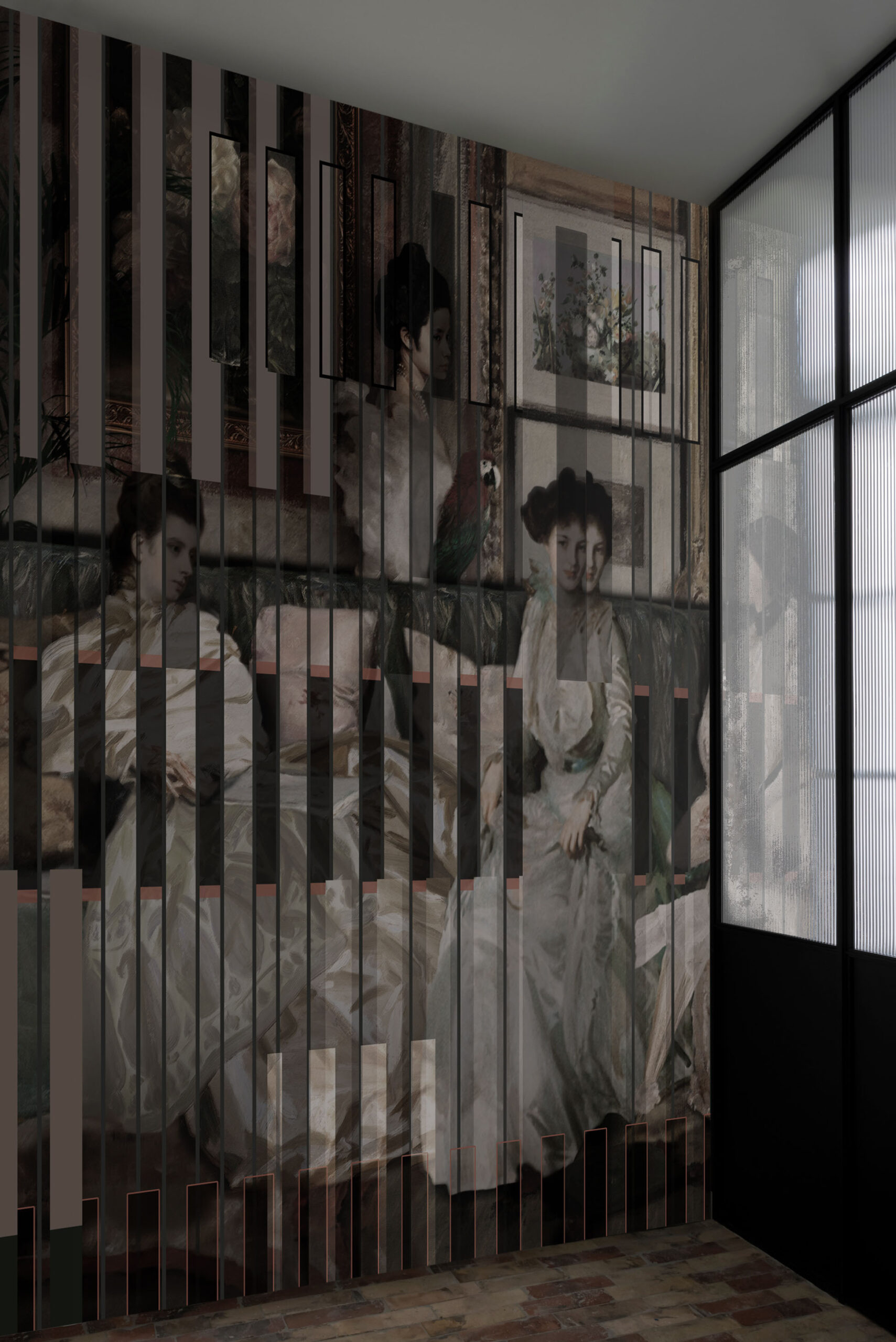Let your wall become the canvas for “The Scene” – a daisy james wallpaper that brings an old-fashioned charm with a touch of wildness. Witness a captivating interplay of a vintage setting and a lively parrot, cleverly viewed through ribbed glass. Its muted colours make it versatile for various settings, making this a wonderfully stylish addition to our collection.