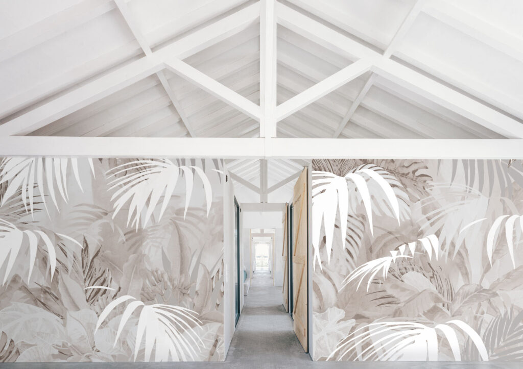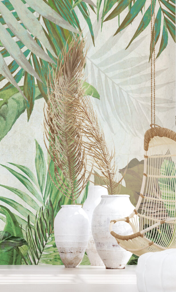 The soft colours create a calming atmosphere, perfect for transforming any space into a stylish oasis. The subtle contrast between the delicate pink hues and the palm leaves adds a refined charm, while the playful design remains thoroughly modern. Ideal for bedrooms, living rooms, or even creative workspaces, this wallpaper combines relaxation with an exotic…