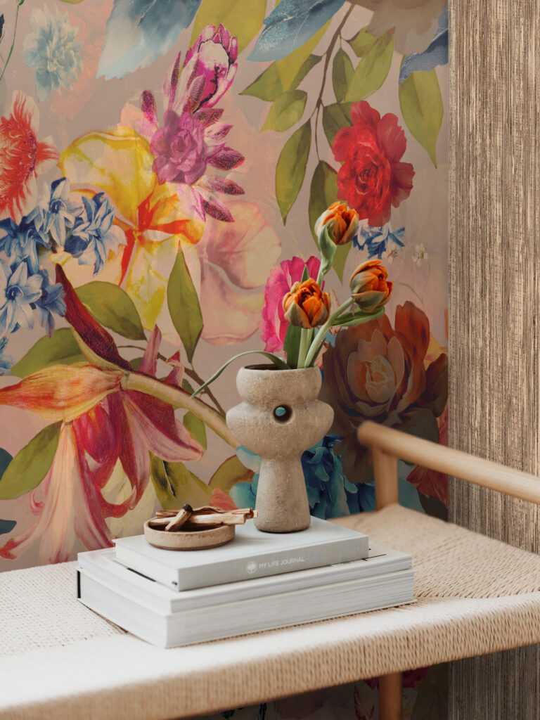 “The Floret” es un elegante papel pintado con coloridas flores que transforman cualquier espacio en un jardín floral. Los juguetones motivos florales en tonos vibrantes añaden alegría a cualquier interior, mientras que los intrincados detalles y los vivos colores proporcionan un aspecto dinámico. El revestimiento mural “The Floret” de daisy james combina perfectamente con la sutil elegancia del “The Ply Beige”. Este color tranquilo y refinado ofrece un bello contraste con las exuberantes flores, realzándose mutuamente y creando un conjunto armonioso. La combinación de “The Floret y “The Ply Beige” confiere a tu espacio un ambiente cálido y acogedor, ideal para cualquier habitación que necesite una actualización fresca e inspiradora. Deja que tu interior brille con la belleza de “The Floret” y el refinado encanto de“The Ply Beige”. Juntos, forman una sinfonía perfecta de color y estilo que da vida a cualquier habitación.