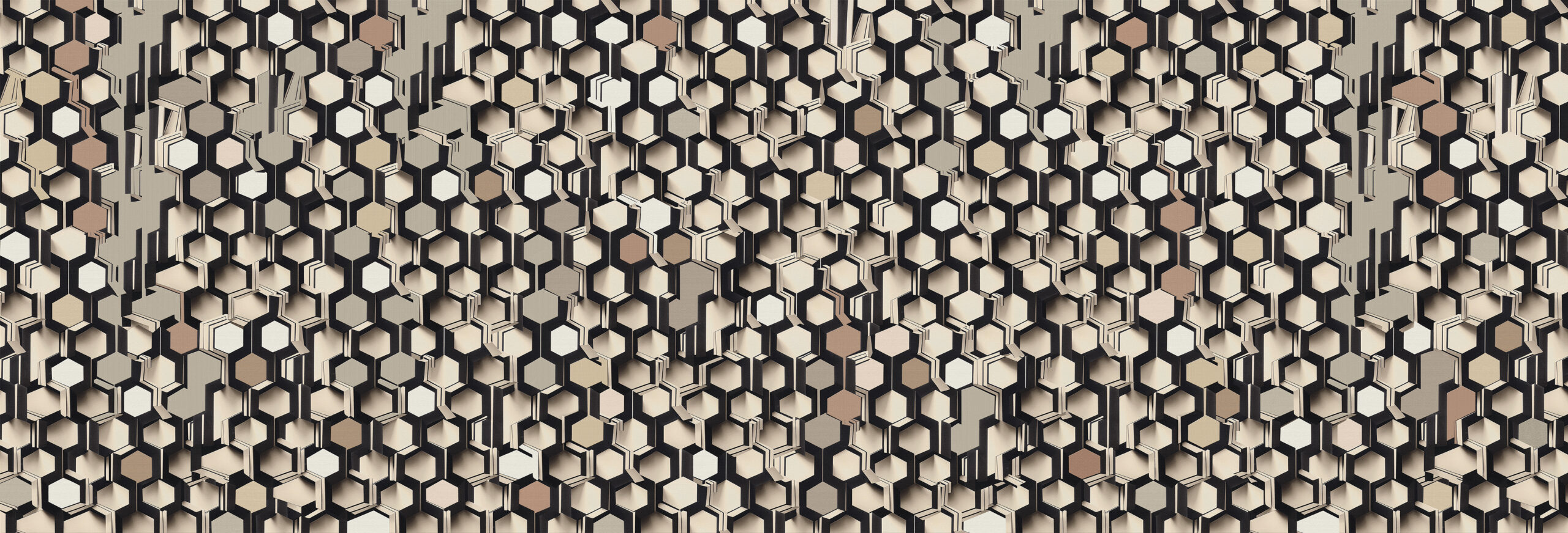 The Buzz” de daisy james respire la modernité avec ses formes hexagonales contemporaines, sa structure en profondeur et une combinaison de couleurs bien pensée. Le contraste entre le noir et le blanc crée un effet visuel saisissant, tandis que les nuances de beige et de gris apportent chaleur et raffinement à l’ensemble. Insufflez cette touche…