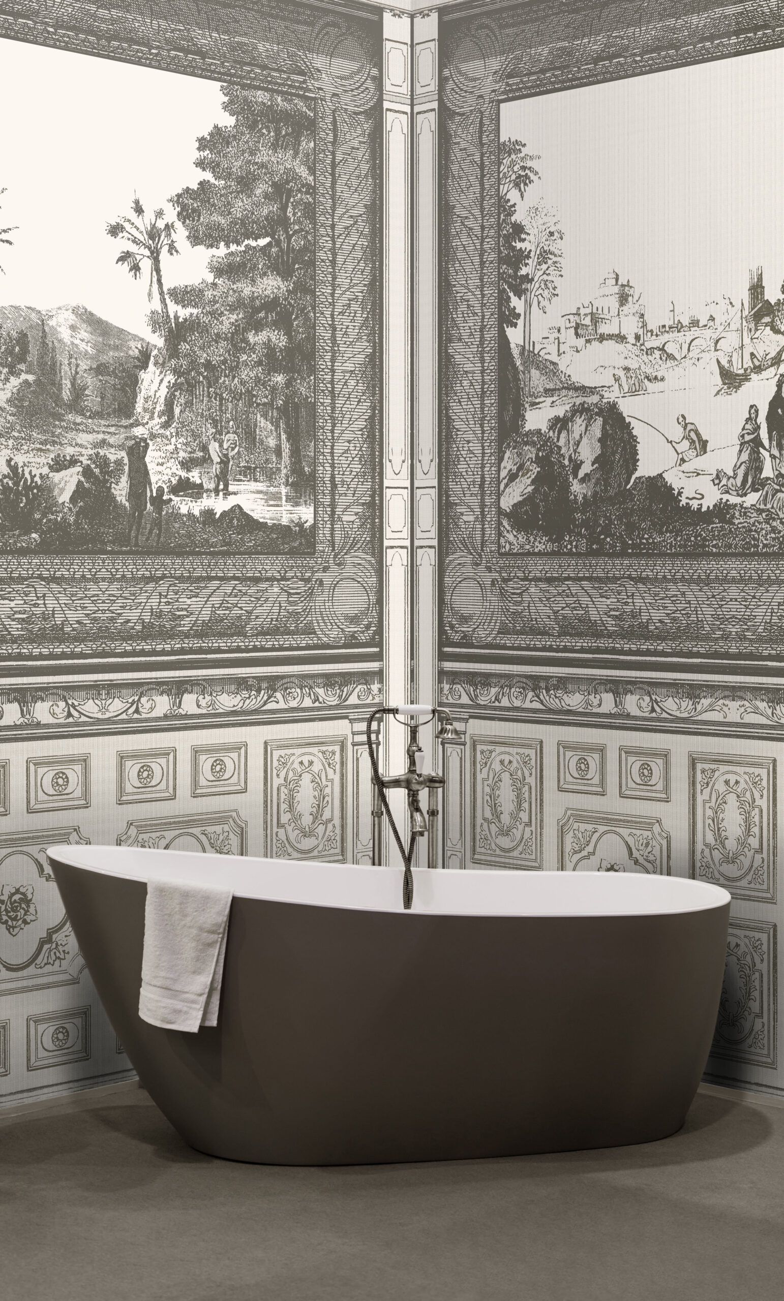 “DES SALLES DE BAINS ROMANTIQUES ENRICHIES DE MOTIFS CLASSIQUES ET D’UNE ÉLÉGANCE INTEMPORELLE”.
