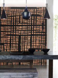 "The Nomad" van daisy james is een sfeervolle wandbekleding in bohemian stijl. Het zwarte netachtige patroon contrasteert mooi met de achtergrond in terra, oranje en donkergrijs, die de uitstraling heeft van een verweerde, oude muur. Een uitgesproken ontwerp dat warmte, karakter en een vleugje avontuur toevoegt aan elke ruimte.