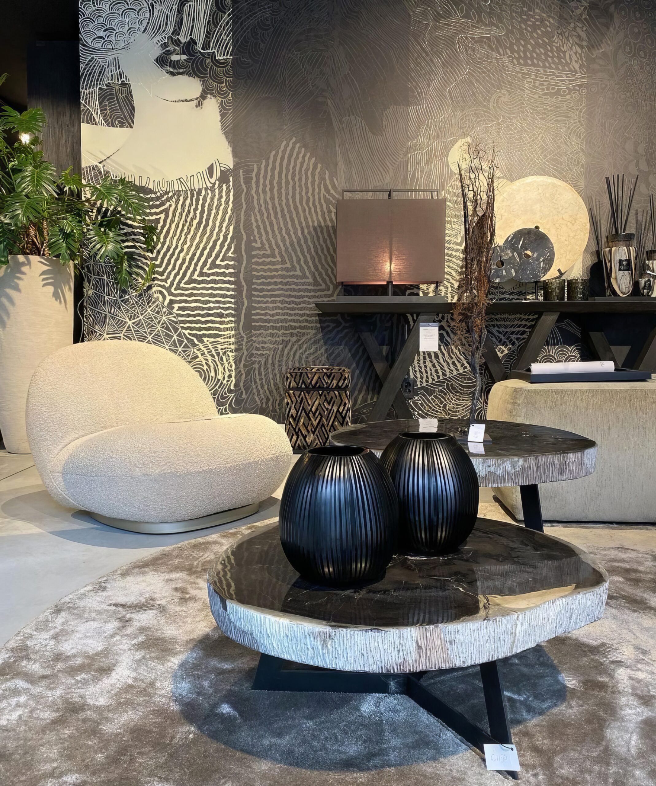 The entire store exudes a warm, serene atmosphere that perfectly complements “The Tribe Collection” by daisy james. This exclusive designer collection consists of no less than six different wallpapers, seamlessly connecting to create a harmonious and stylish whole. “The Tribe Collection” adds an extra layer of luxury wallcovering to the store’s atmosphere, enhancing the unique character of this inspiring design store. Several designs from this collection have been applied in the store. Wallcoverings with faces in warm beige tones, combined with black accents, form the perfect backdrop for any design enthusiast. These exclusive wallpaper collections perfectly complement the elegant and serene ambiance that the store exudes.