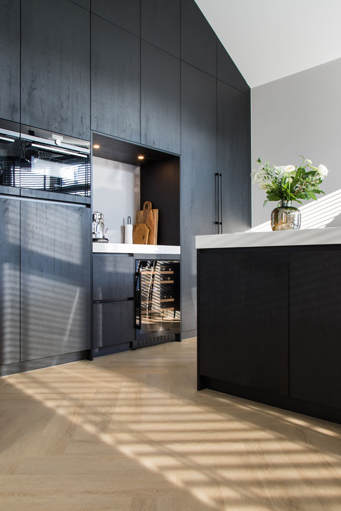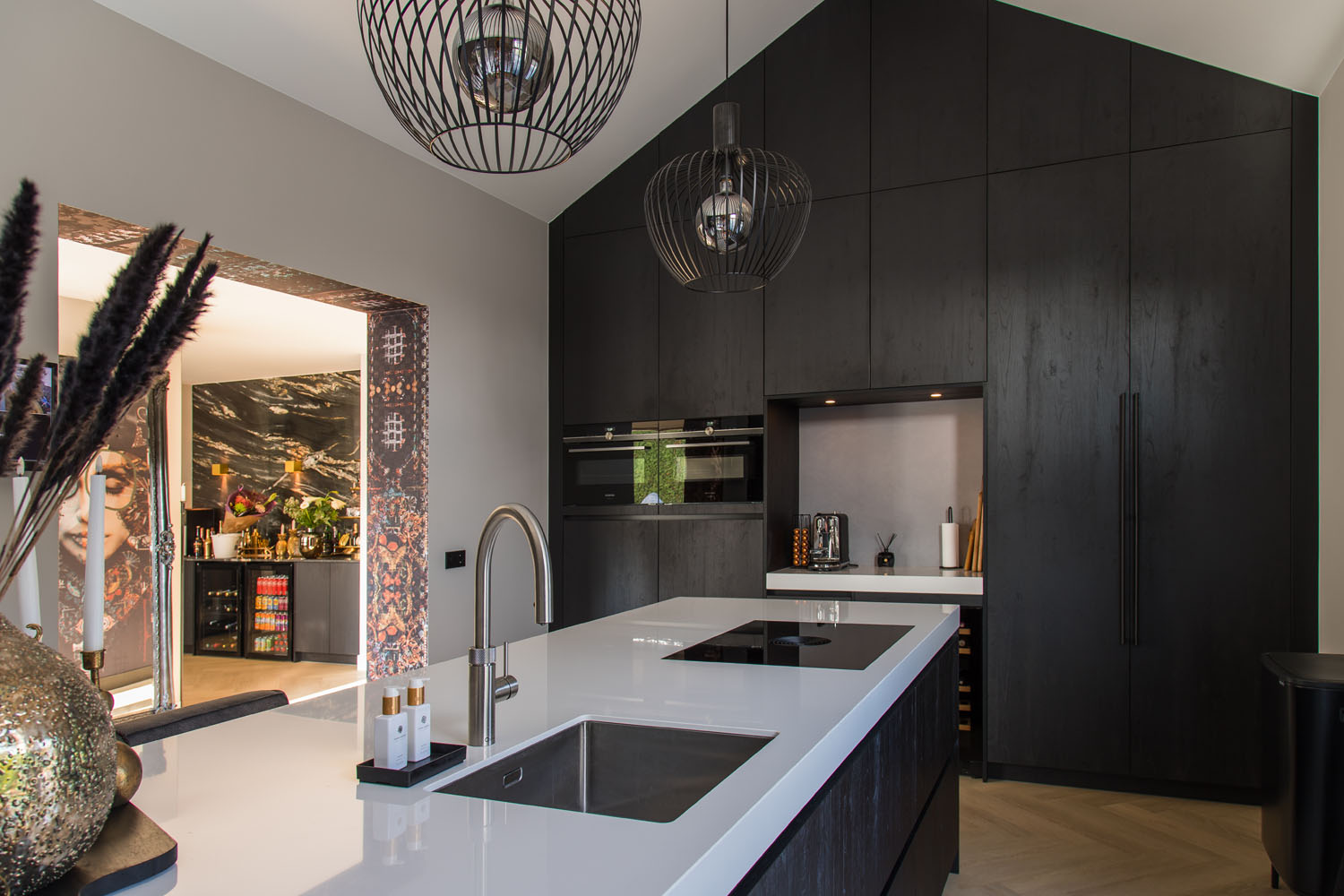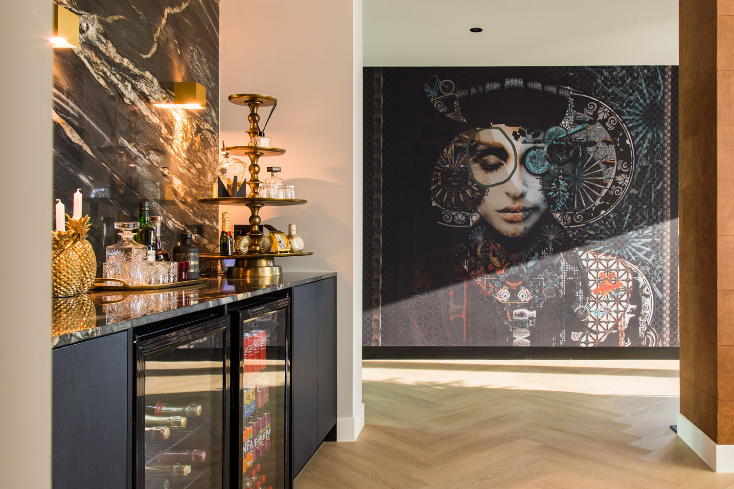 The use of refined materials such as marble, oak, and various dark wood tones results in a rich and layered interior experience. Bold design statements are made through the incorporation of large black surfaces, while the unique wallcovering “The Private Label” by daisy james adds a subtle, artistic touch.