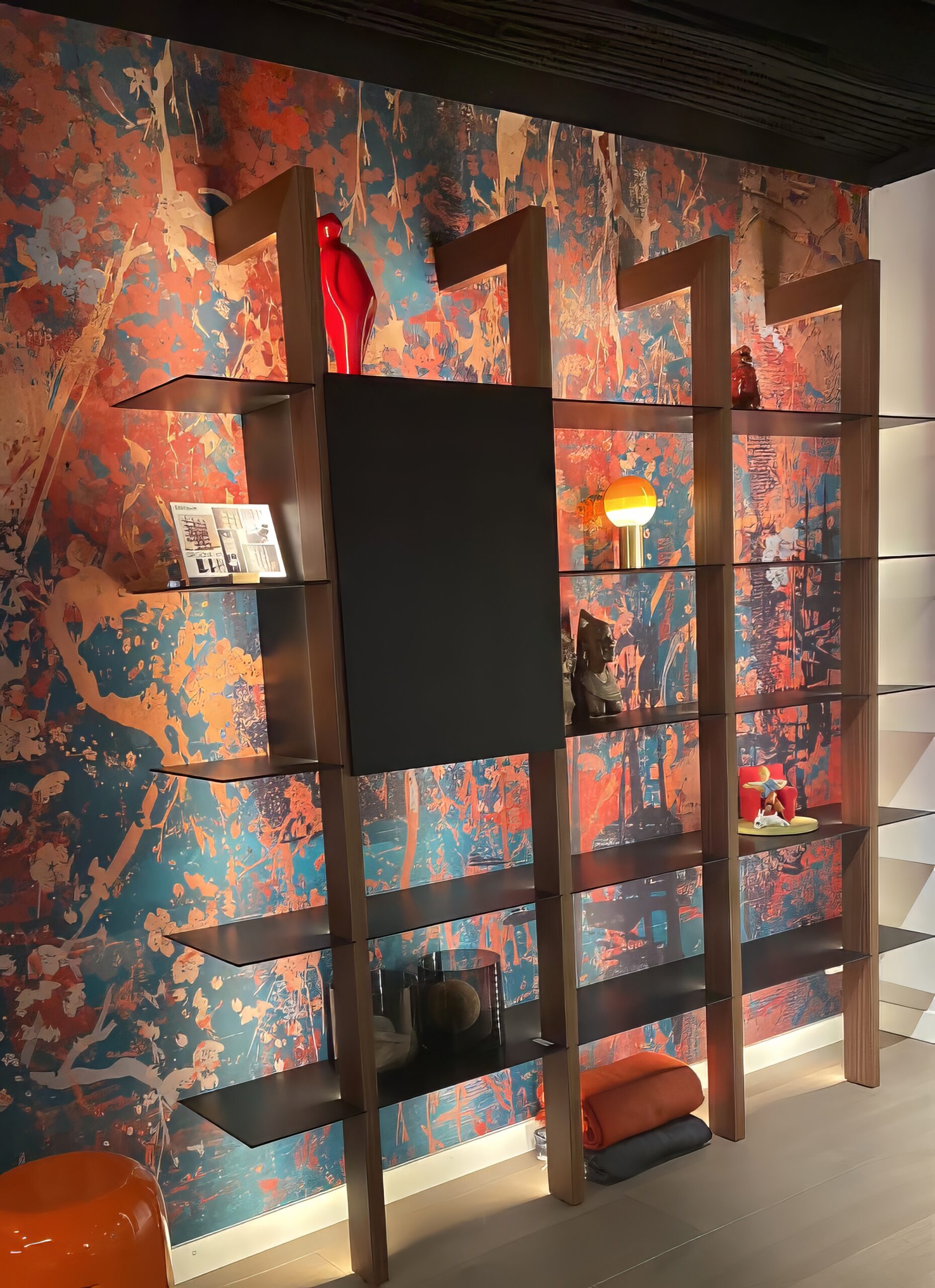 Prachtwonen is a special, atmospheric design furniture store in Bergen op Zoom – The Netherlands, featuring well-known furniture brands and beautifully designed spaces. In one of these rooms, they have applied the bold “The Splash No.2″ wallpaper by daisy james in a way that everyone would love to have in their own living room. With a sleek design cabinet in front of it, incorporating colour accents from the wallpaper and built-in lighting, the colours of this luxury wallpaper are highlighted even more. The overall effect feels like a piece of art in your living room, where you can keep admiring the details. The graffiti-like atmosphere of “The Splash No.2″, with warm colours like red, orange, white, blue, and gold, makes this design wallpaper truly exceptional. This unique wallpaper is frequently used in living rooms and other interiors, providing a modern and artistic look. Our clients love incorporating “The Splash No.2″ into various projects, and we are proud of how much ambiance this wallpaper brings to living rooms and design interiors.
