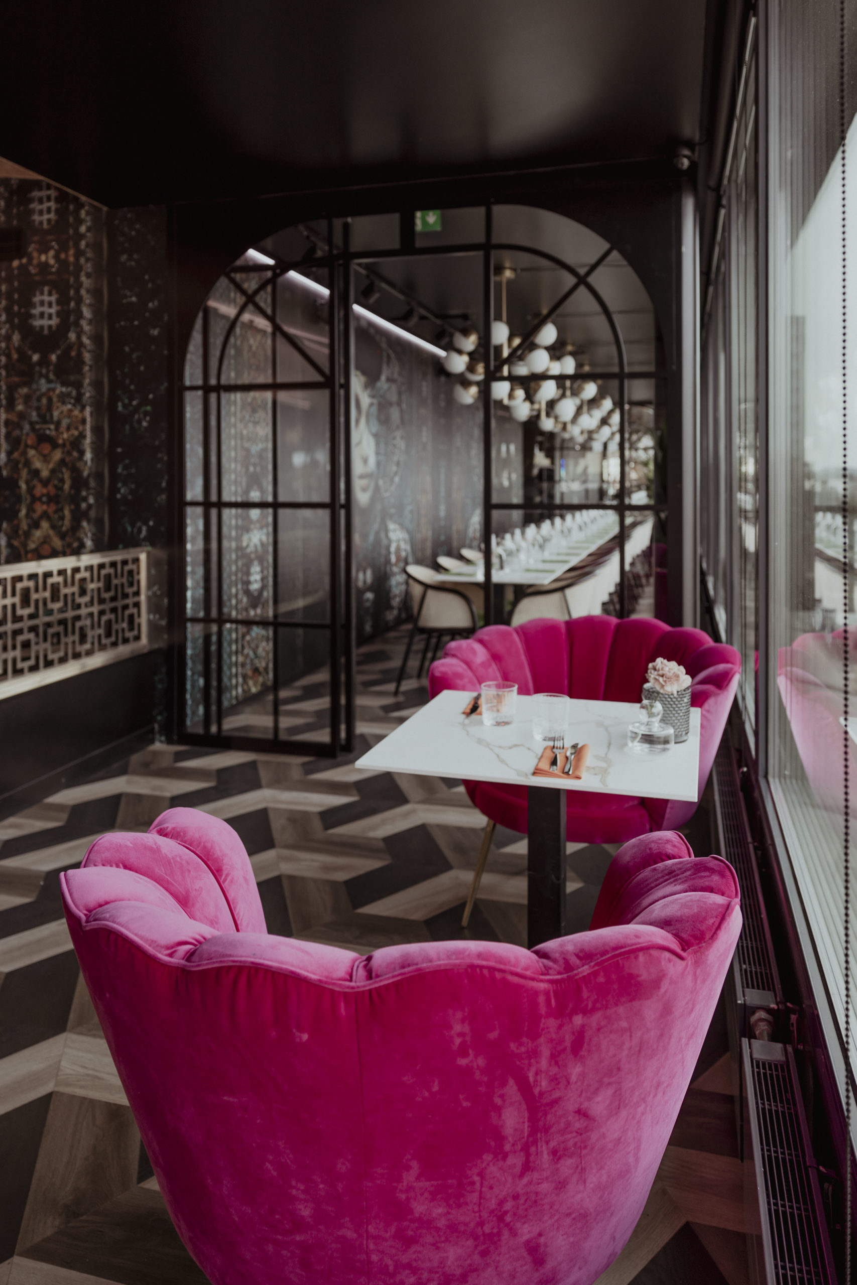 The Art Deco ambience is enhanced by classic elements such as dark parquet floors and furniture with rounded, decorative forms. The modern twist is evident on the walls with the striking wallpaper. The faces and subtle, artistic details in the design give the space a playful, contemporary feel. This mix of Art Deco nostalgia and modern design influences creates a harmonious balance between traditional and contemporary, resulting in a unique and inspiring atmosphere in this interior.