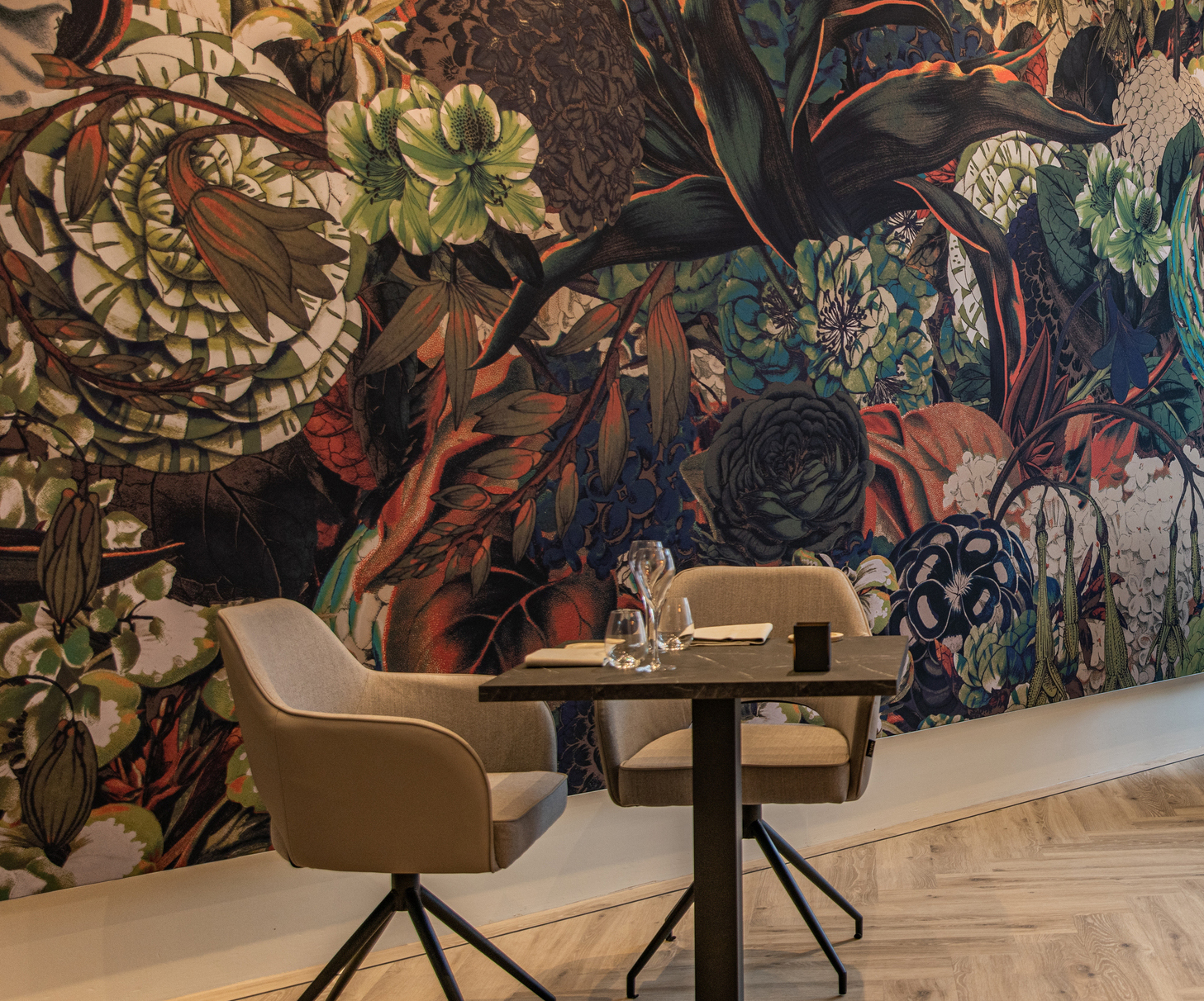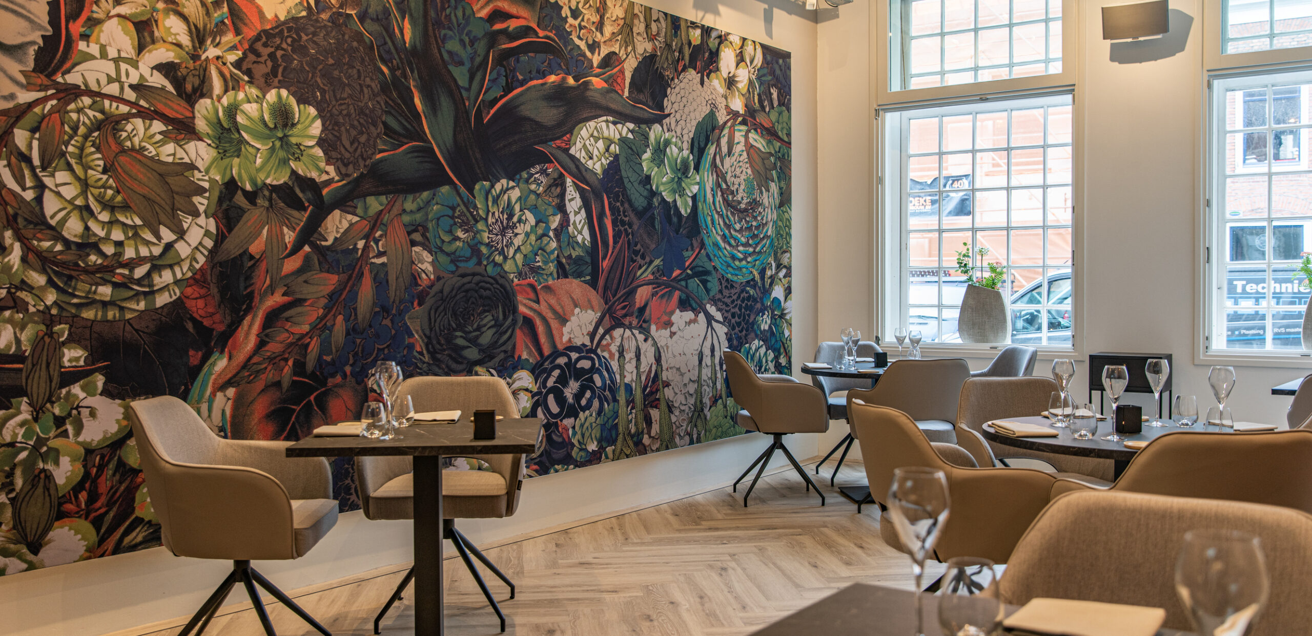 Restaurant Maeve has chosen the daisy james wallpaper The Flowery”, applied in two different options: seamless wallpaper and acoustic fabric. The acoustic fabric not only helps to reduce noise but also creates the appearance of a large painting. With its colour combination of orange, blue, white, and green, the space has been transformed into a truly inspiring environment.