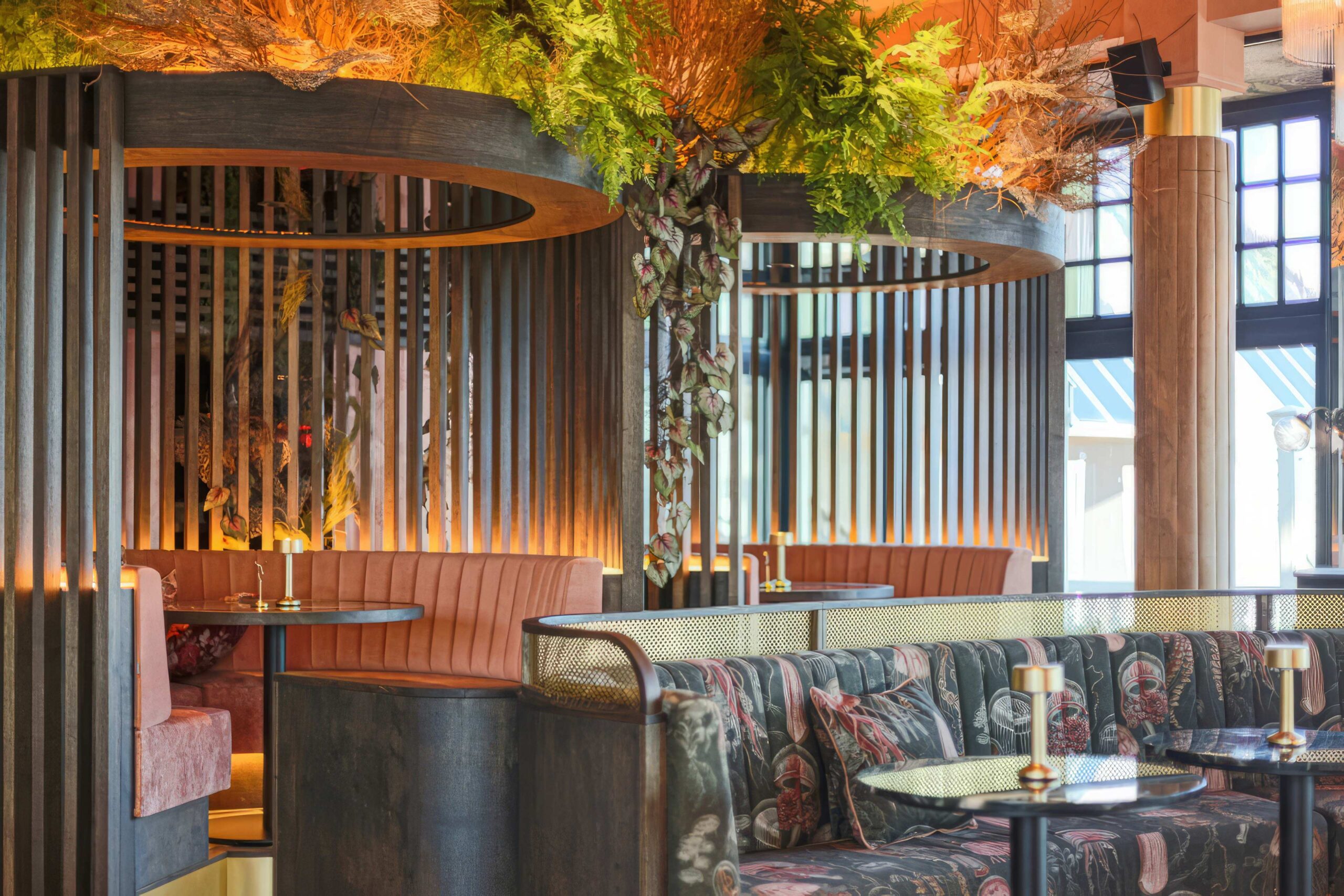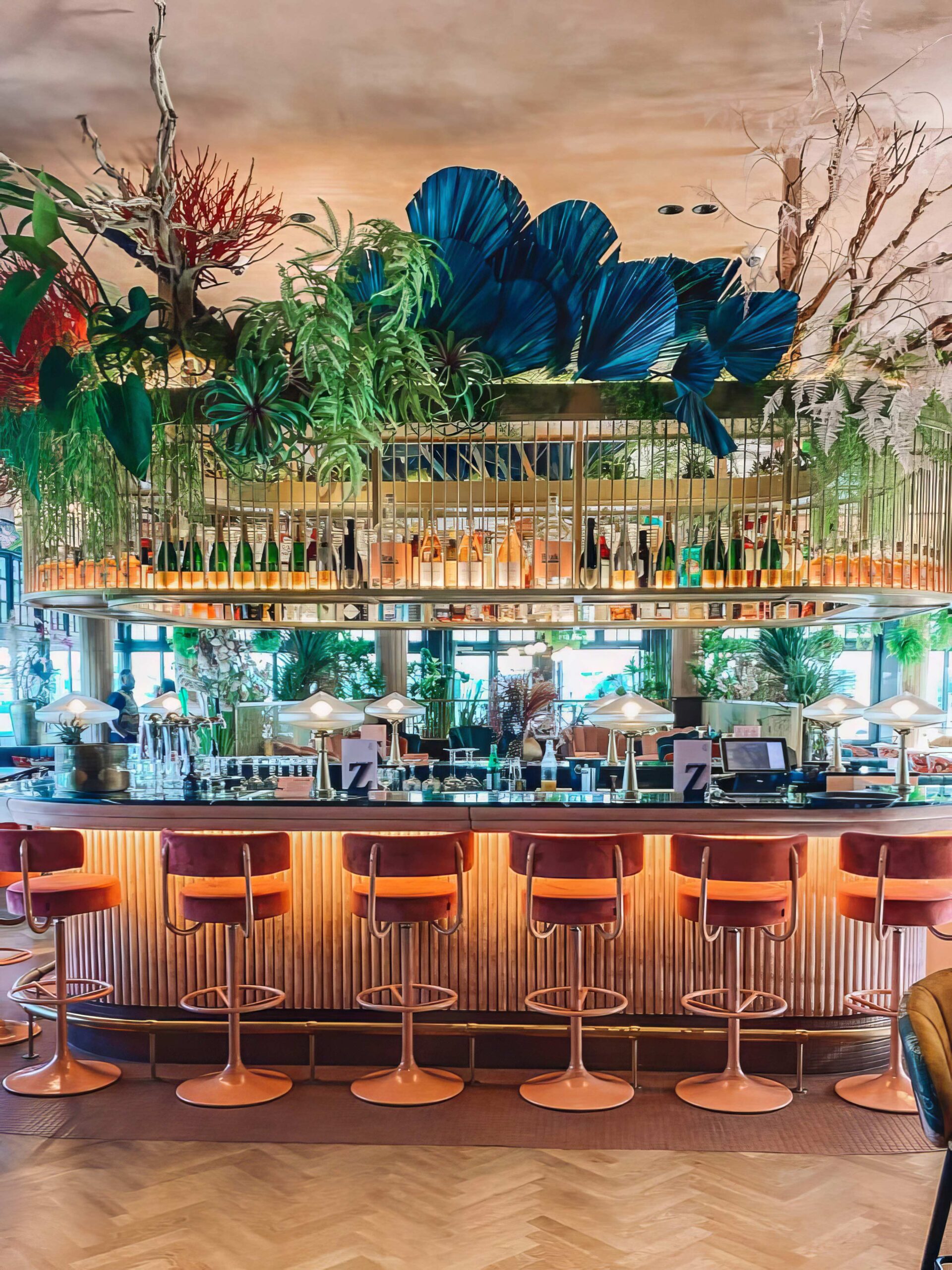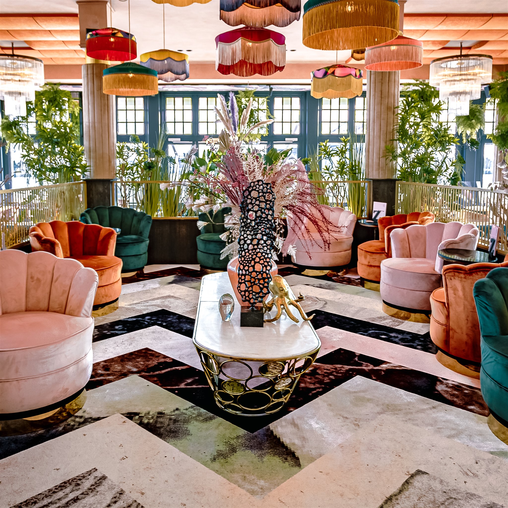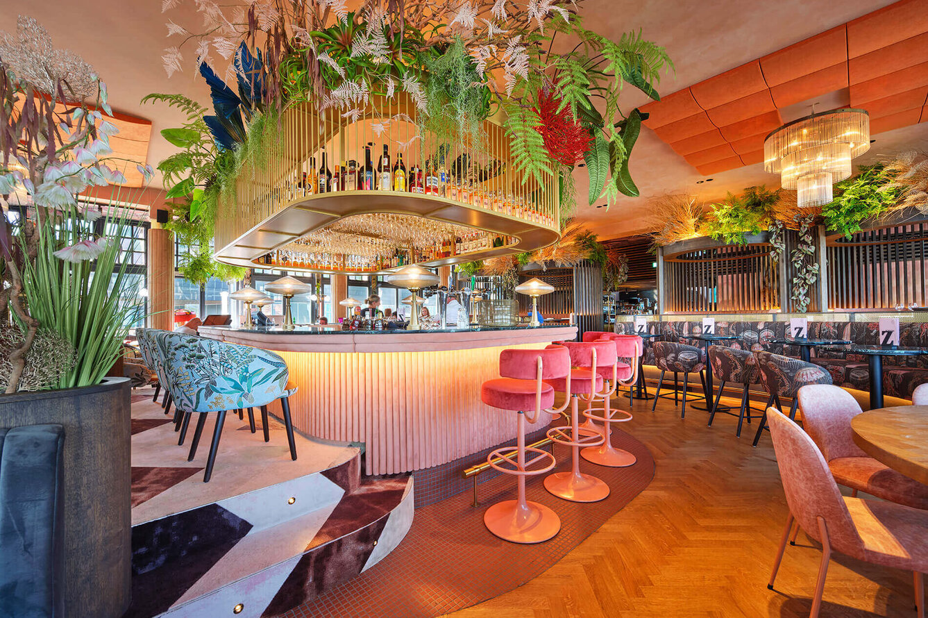 Het Zalmhuis in Rotterdam is a truly unique project. From the moment you enter, you are greeted by an impressive entrance with a grand, ornate staircase that leads past the first bar and onto various seating areas. This journey alone is a true experience, featuring striking colour combinations, various daisy james wallcoverings, rich decorations, and artistic floral arrangements. Het Zalmhuis truly offers a sensory delight.