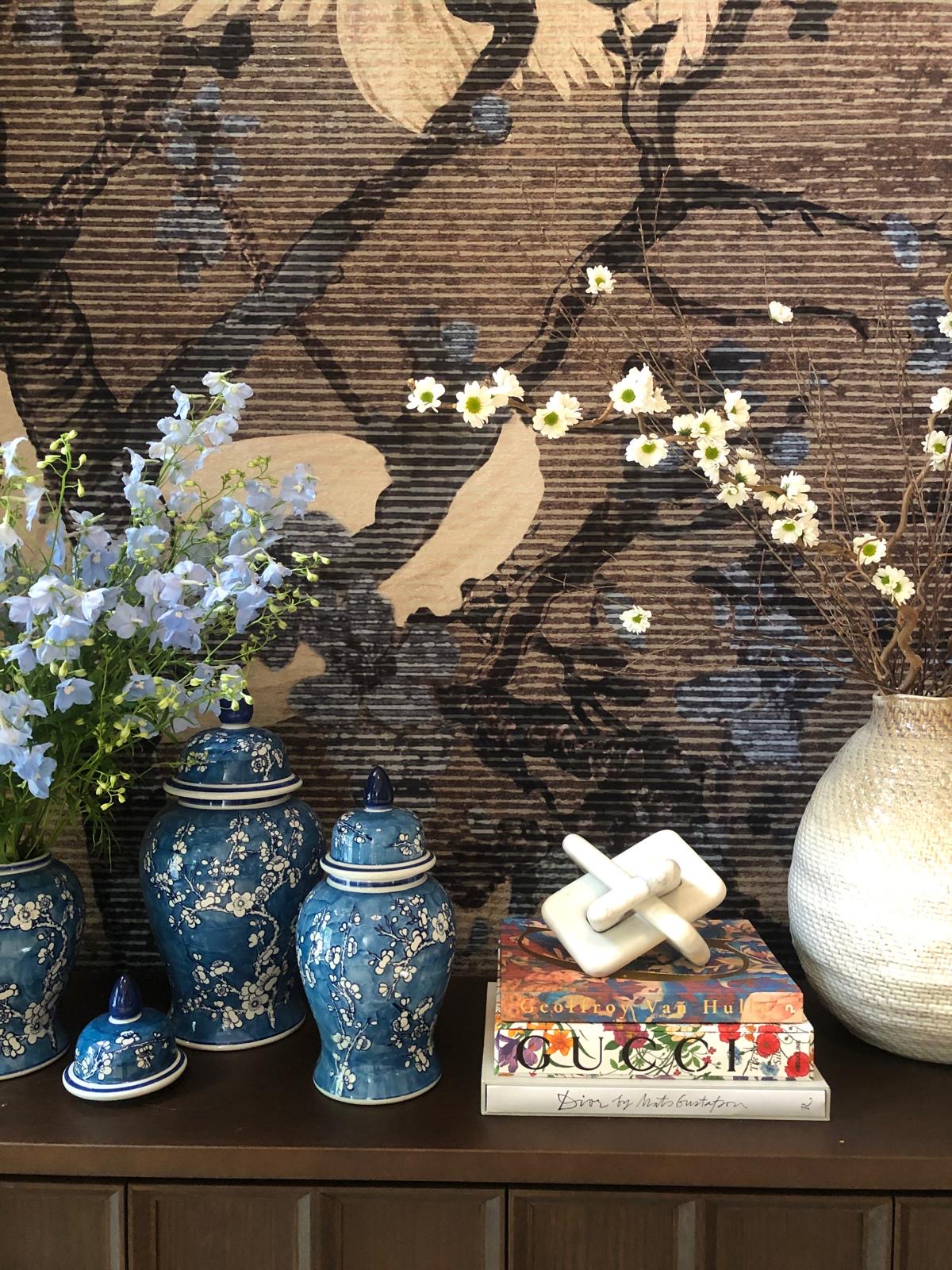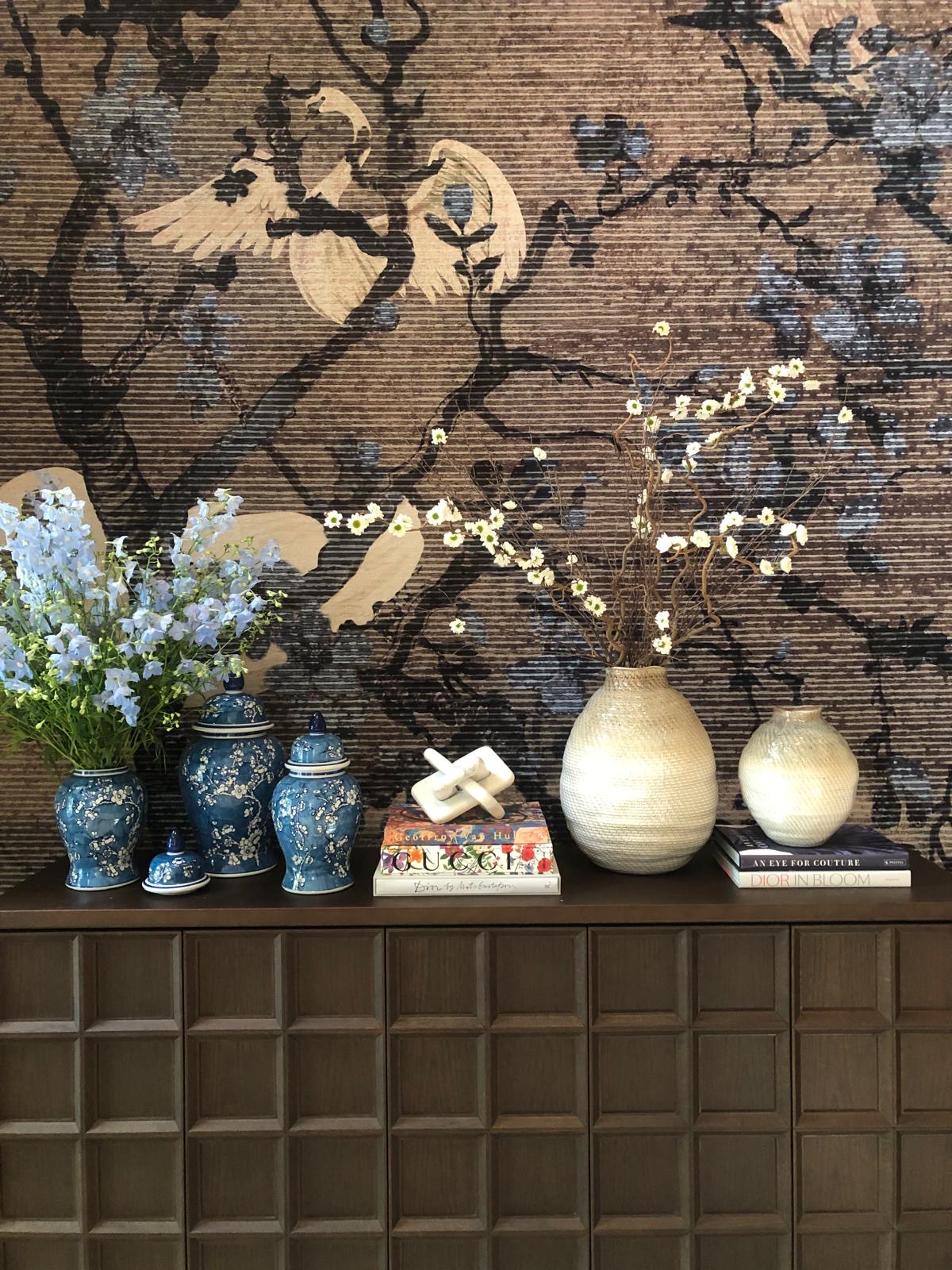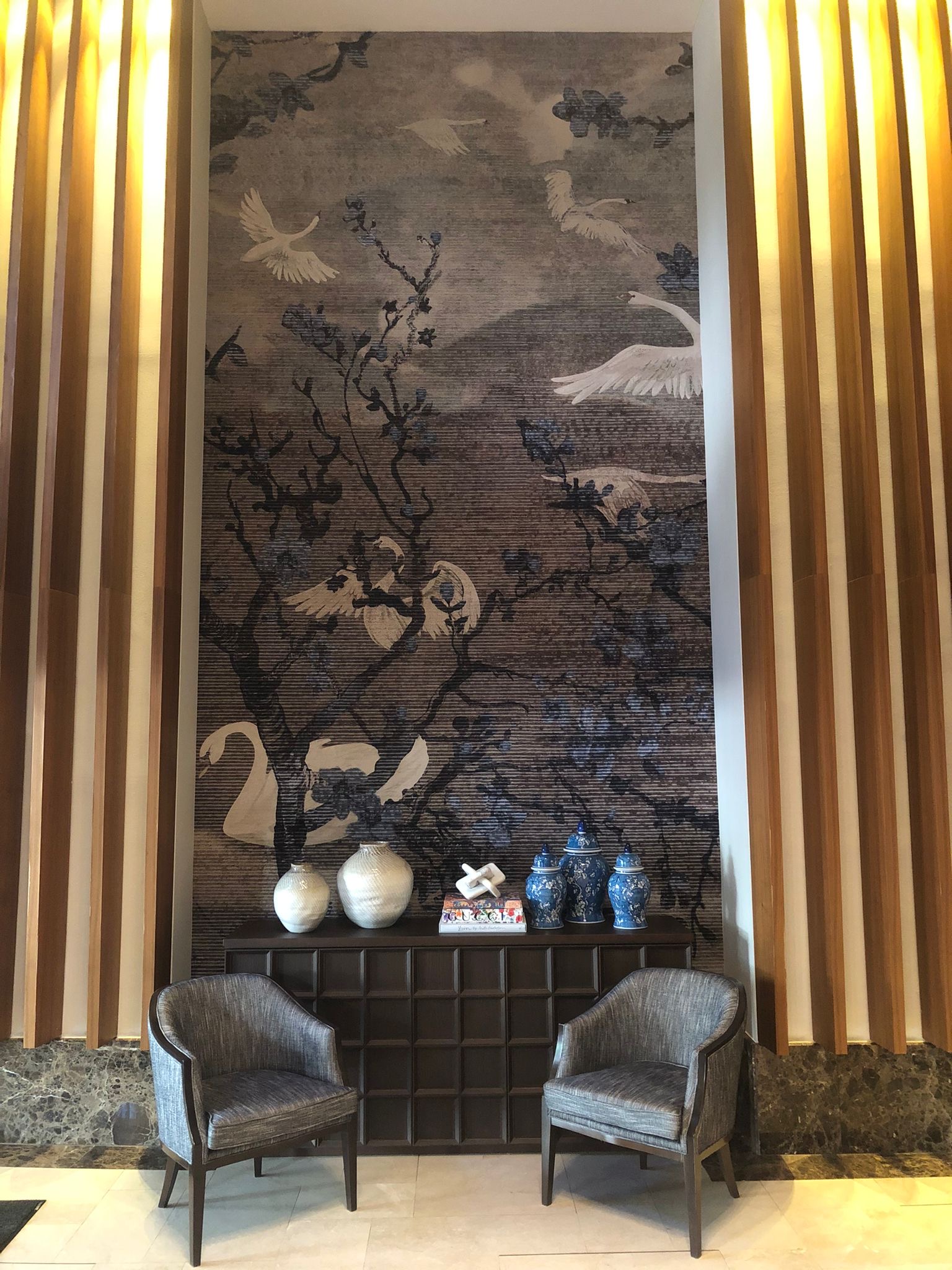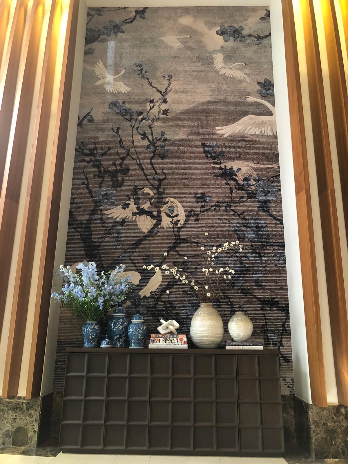 In the impressive entrance of the prestigious Ritz-Carlton Hotel in Vienna, “The Lake Petrol” from our daisy james collection takes center stage. With an impressive height of 500 cm, this design makes a bold, majestic statement. Combined with refined accessories and elegant horizontal wooden slats on the surrounding walls, the space radiates both character and timeless sophistication.
