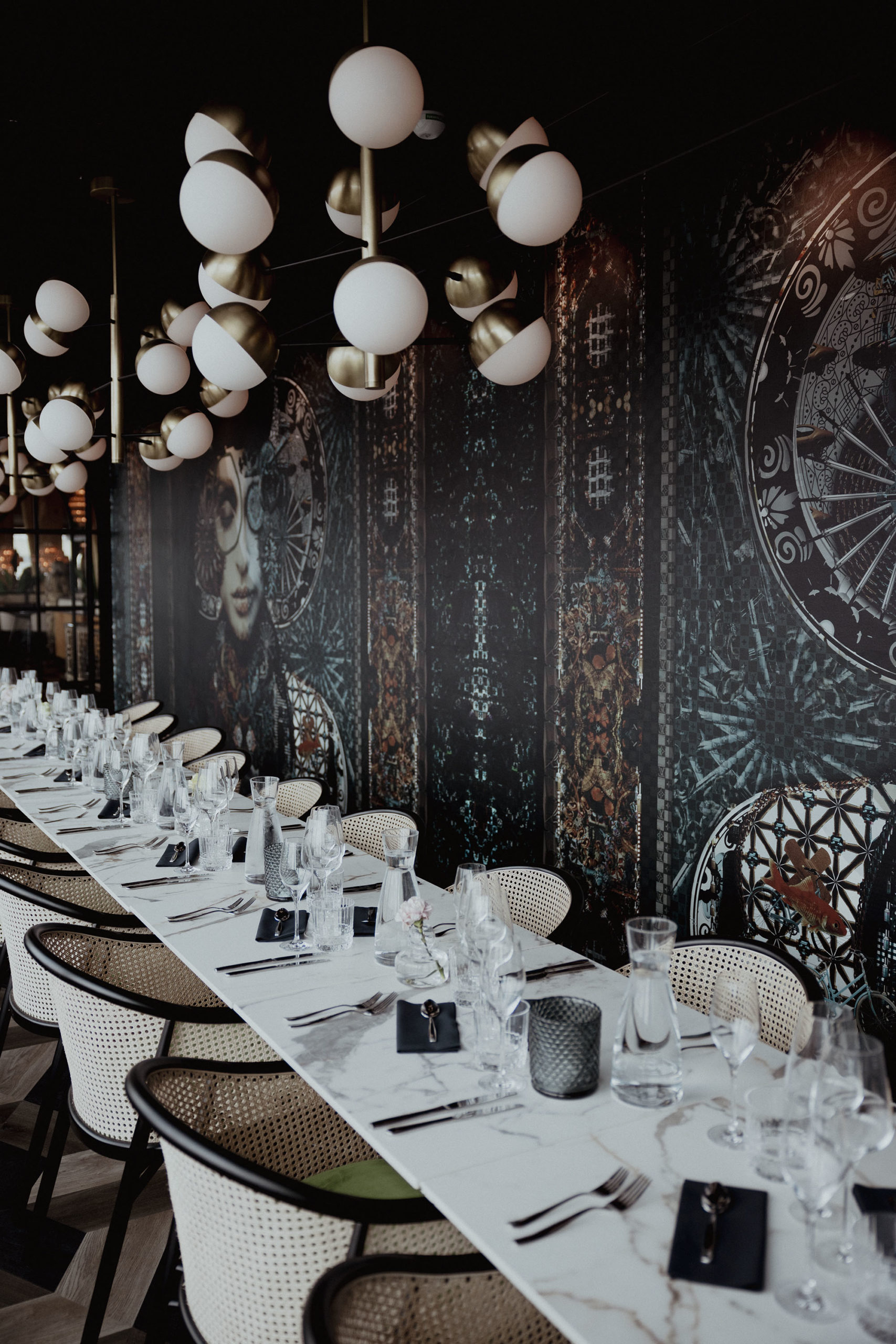 The Art Deco ambience is enhanced by classic elements such as dark parquet floors and furniture with rounded, decorative forms. The modern twist is evident on the walls with the striking wallpaper. The faces and subtle, artistic details in the design give the space a playful, contemporary feel. This mix of Art Deco nostalgia and modern design influences creates a harmonious balance between traditional and contemporary, resulting in a unique and inspiring atmosphere in this interior.