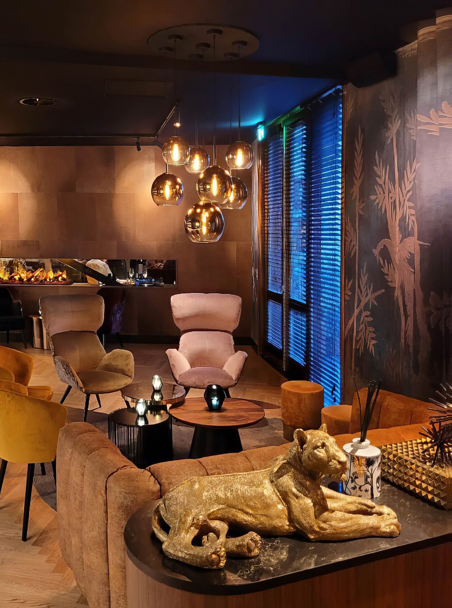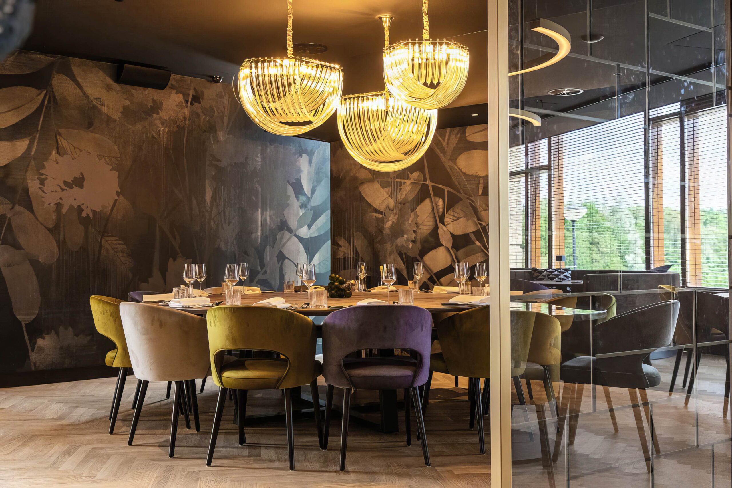 For this large and unique restaurant, we provided a range of daisy james wallcoverings, including “The Ash No.3”, “The Green Orchid”, “Blue Orchid”, “The Wooden Face”, “The Loom Blue”, “The Viridity Green”, “The Zircon”, and “The Splash No.2”. These different styles contribute to the unique and luxurious look of the interior design. The interior of Restaurant Bordeaux in Naarden – The Netherlands stands out for its combination of luxurious materials and refined details, making it a true hotspot by the Gooimeer. Below, you’ll find interior images showcasing a part of the interior design.