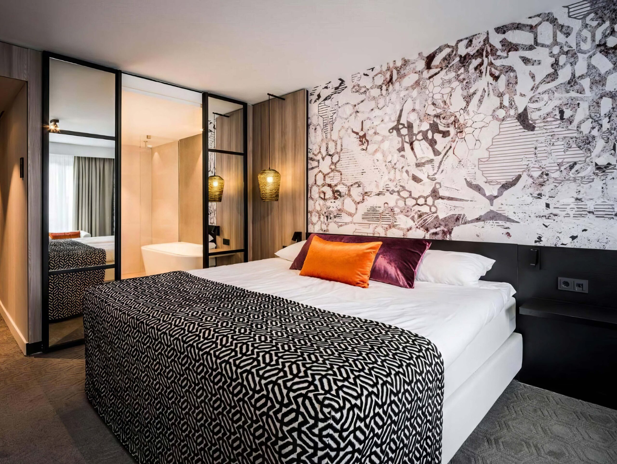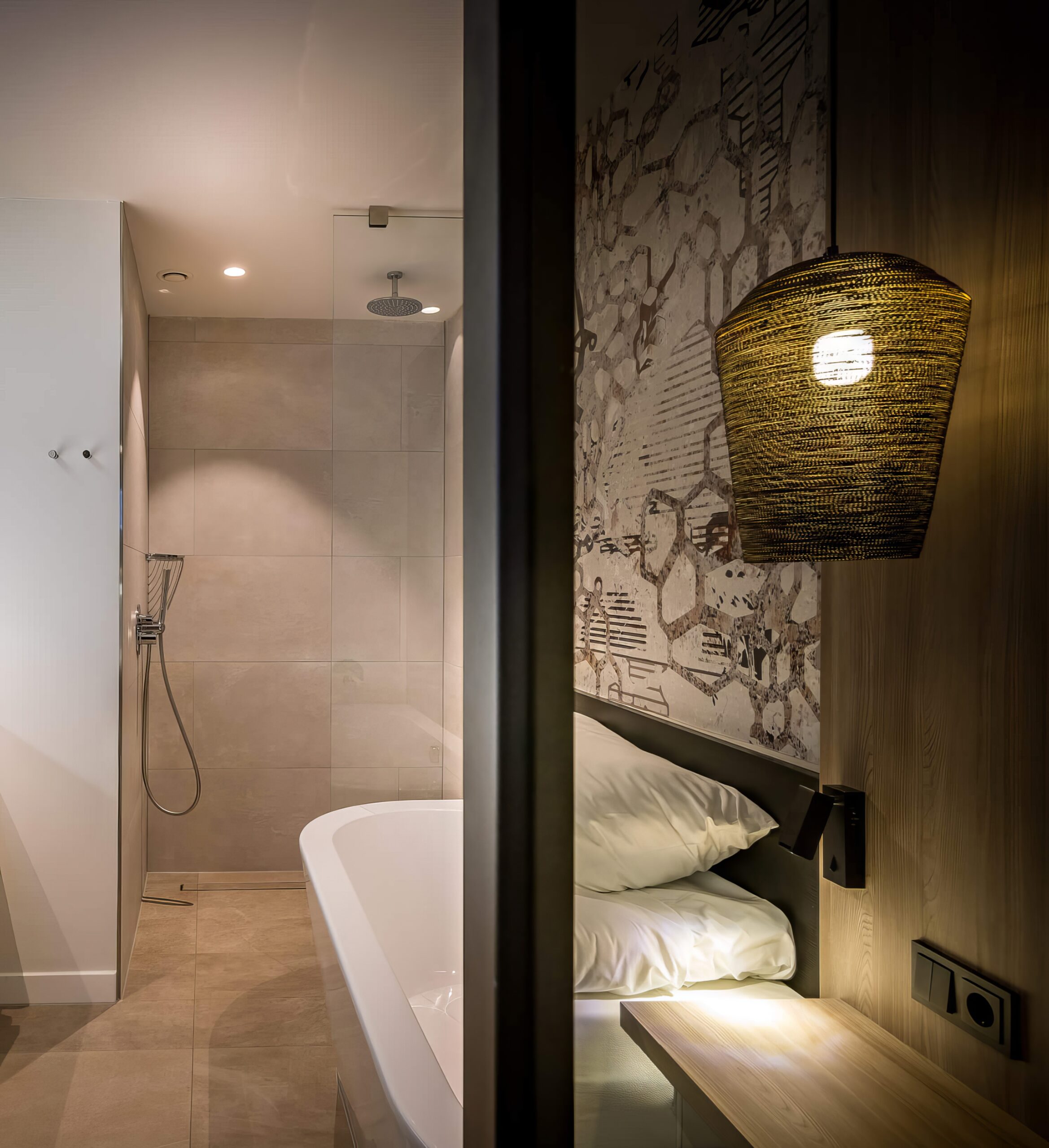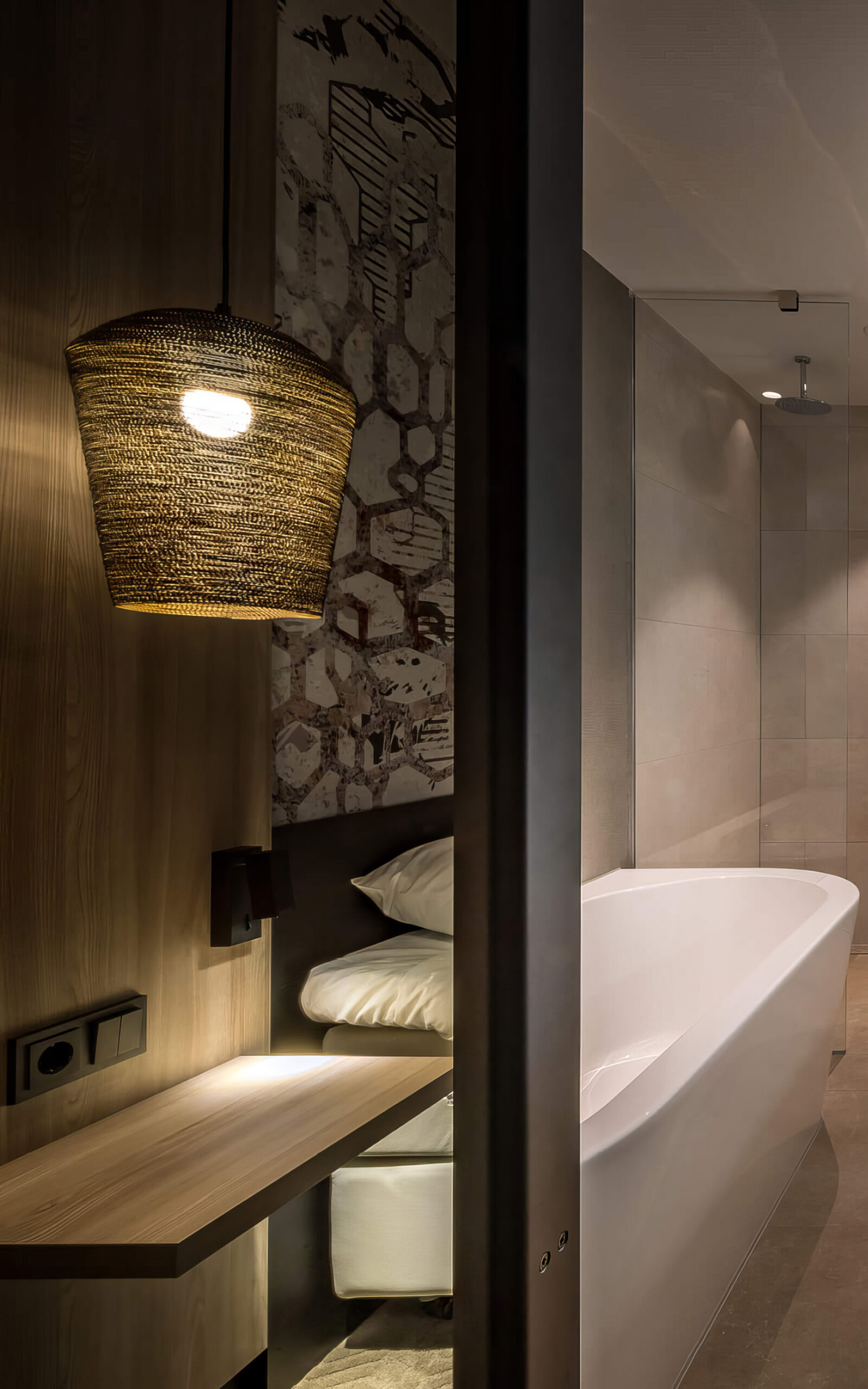 For the hotel rooms, daisy james wallpaper “The Bengal” was chosen, a graphic wallpaper with a pattern in beige and white tones. Upon closer inspection, you discover a subtly incorporated tiger design, providing a surprising and impressive backdrop for these rooms.